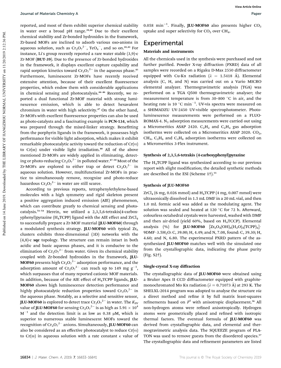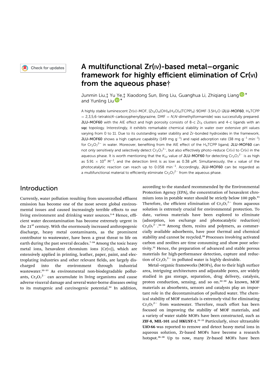 目前,由于不受控制的污水造成的水污染排放已成为全球最严重的环境问题之一,对我们的影响日益严重生活环境和饮用水源。1-6因此,高效的水净化已成为21世纪的当务之急。随着人为排放的大量增加,重金属污染物作为废水的主要来源,在过去的几十年对地球上的生命构成了巨大的威胁。7-10在有毒重金属离子中,广泛应用于印刷,皮革,造纸,油漆和电热工业以及其他相关领域的六价铬离子(Cr(VI)),主要通过工业废水的方式被排放到环境中。11-13Cr2O72-作为环境不可生物降解的污染物,由于其诱变和致癌性,可在活生物体中积累并造成不利的内脏损害和几种水传播疾病。14此外,根据环境保护署(EPA)推荐的标准,饮用水中的六价铬离子浓度应严格低于100ppb。15因此,有效去除水溶液中的Cr2O72-对环保而言至关重要。迄今为止,已经探索了各种材料来消除(吸附,离子交换和光催化还原)Cr2O72-。16–19其中,树脂和聚合物作为市售吸附剂,具有较差的热稳定性和化学稳定性,无法回收利用。20 涉及活性炭和沸石的工艺非常耗时,并且显示出较差的选择性。21因此,迫切需要制备先进,稳定的多孔材料,用于高效检测,捕获和还原污水中的Cr2O72-。由于金属有机框架(MOFs)的高表面积,引人入胜的结构和可调节的孔隙,因此在气体存储,分离,药物输送,催化,质子传导,传感等方面进行了广泛的研究。22-30 用作吸收剂,传感器和催化剂的MOF材料在净化污水中起着重要的作用。MOF材料的化学稳定性对于消除废水中的Cr2O72-至关重要。 因此,人们集中精力改进MOF材料的稳定性,并构建了多种水稳定性MOF,例如ZIF-8,MIL-101和HKUST-1.31-35尤其是自从报道了超稳定的UiO-66以来,为了去除和检测水溶液中的重金属离子,基于Zr的MOFs已成为研究热点。36–38迄今为止,已经报道了许多基于Zr的MOFs,其中大多数在广泛的pH范围内的水中均显示出优异的化学稳定性。39,40由于其出色的化学稳定性和骨架中与Zr键合的氢氧化物,基于Zr的MOFs倾向于吸附水溶液中的各种含氧阴离子,如Cr2O72-,TcO4-等。41,42例如,Lis 小组最近报告了一种罕见的水稳定剂(3,9)-c Zr-MOF(BUT-39)。由于骨架中存在Zr键合的氢氧化物,因此对水相中的Cr2O72-显示出优异的捕获能力和的快速吸附力。43此外,发光Zr-MOFs由于其出色的荧光性质而最近受到了广泛的关注。44-46最近,我们报道了一种具有强发光性的双功能Zr-MOF材料,该材料能够以高选择性检测水中的六价铬。47另一方面,具有优异的荧光性质的Zr-MOFs也可以用作光催化剂,并且令人着迷的例子是通过混合连接剂策略制备的PCN-134。得益于骨架中的卟啉配体,它具有可见光吸附的高性能,这使其在可见光照射下对Cr(VI)还原为Cr(III)表现出显著的光催化活性。48以上所有提到的Zr-MOFs被广泛应用于消除,检测或光还原污水中的Cr2O72-。47-50大多数Zr-MOFs被研究用来捕集或检测水溶液中的Cr2O72-。但是,实际上仍旧缺乏同时去除,识别和光还原水中有害Cr2O72-的多功能Zr-MOFs。