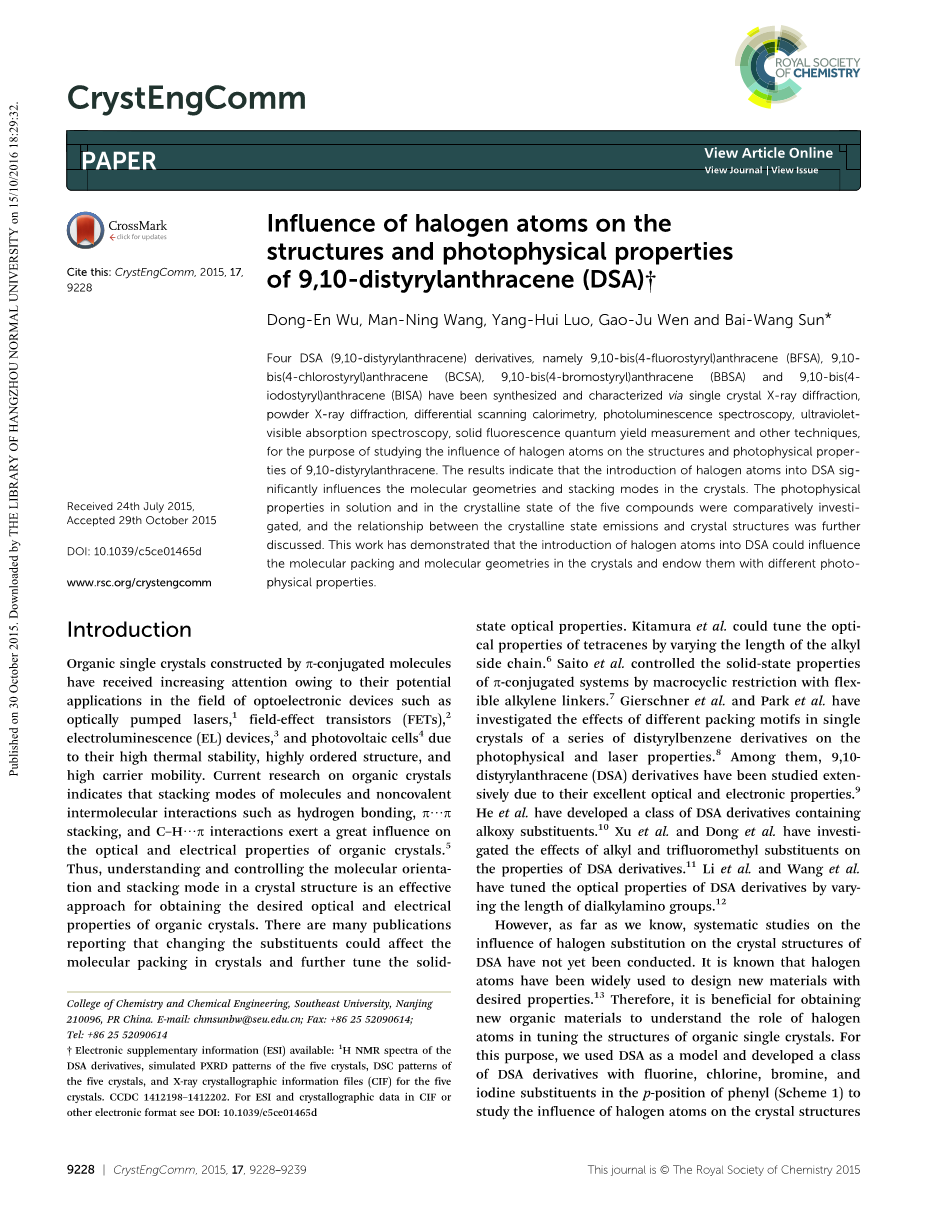 卤素原子对9,10-二苯基蒽(DSA)结构和光物理性质的影响外文翻译资料
