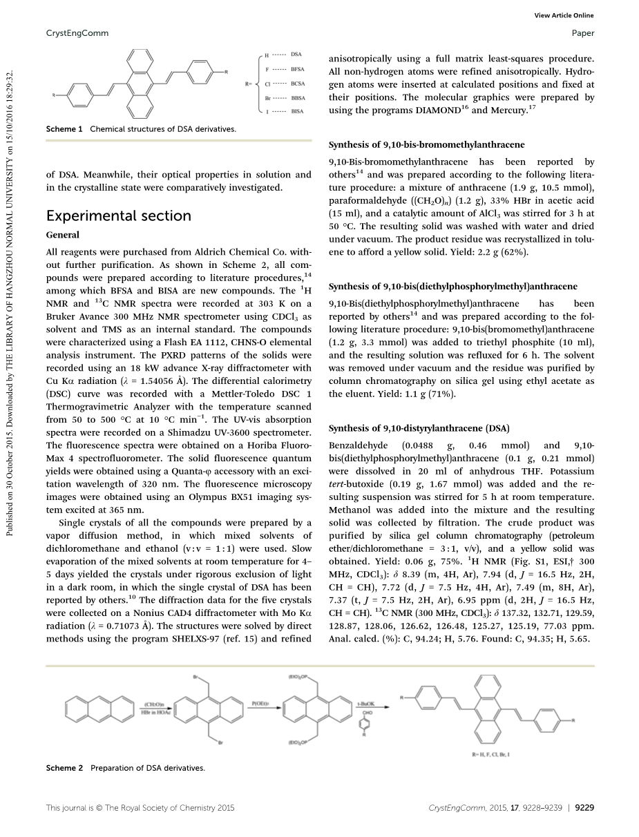 通过蒸气扩散法制备所有化合物的单晶,其中使用二氯甲烷和乙醇(v:v = 1:1)的混合溶剂。 在室温下缓慢蒸发混合溶剂4-5天,在暗室中严格排除光,得到晶体,其中DSA的单晶已被其他人报告。收集了五种晶体的衍射数据,具有MoKalpha;辐射(lambda;=0.71073Aring;)的Nonius CAD4衍射仪。使用程序SHELXS-97(参考文献15)通过直接方法解析结构,并使用全矩阵最小二乘法程序各向异性地精制。 所有非氢原子均各向异性地精制。 将氢原子插入计算位置并固定在它们的位置。分子图形是使用DIAMOND和Mercury程序制备的。