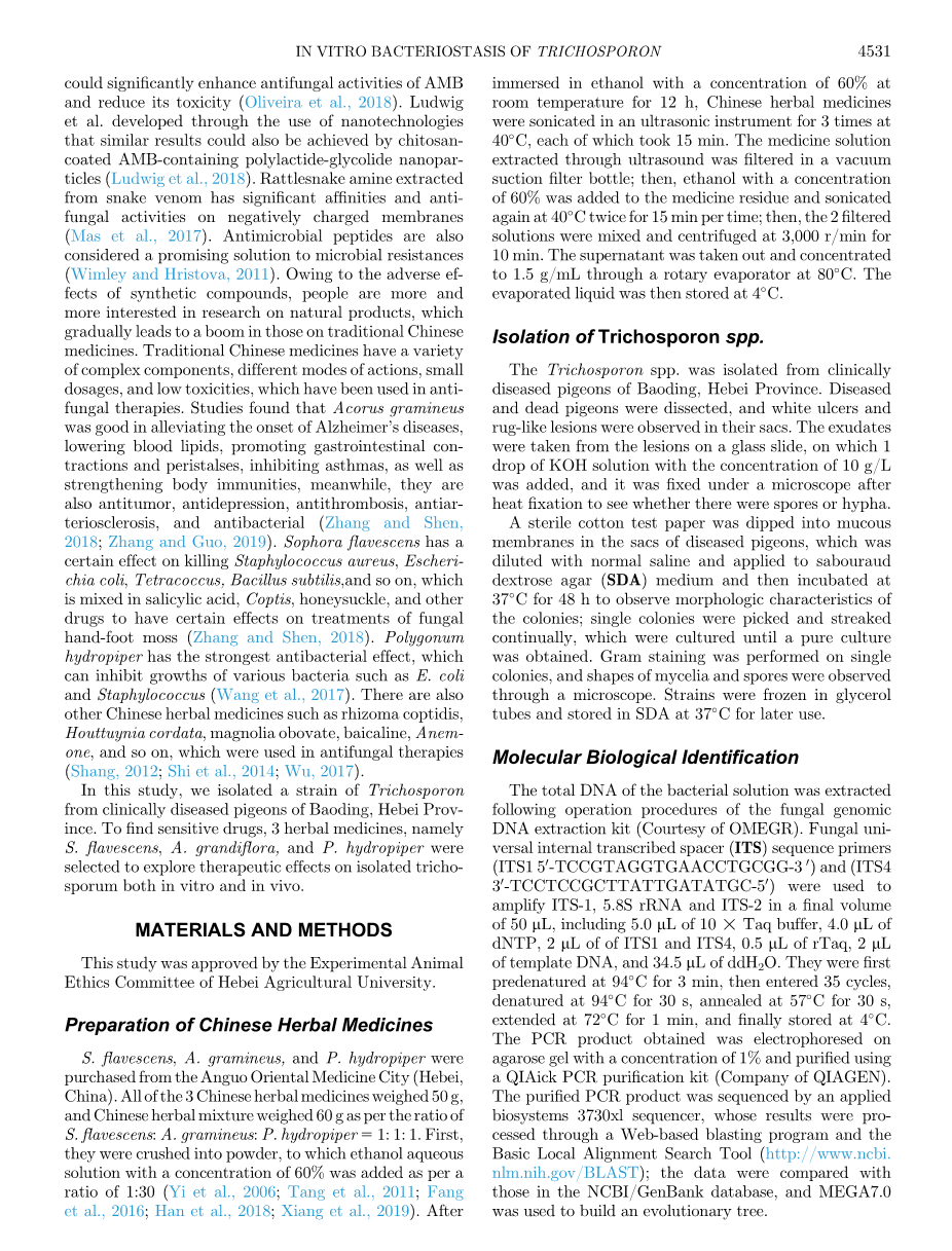 虽然关于毛孢菌感染的报道越来越多,但关于毛孢菌的毒力因素、致病过程和抗真菌耐药性机制的报道相对较少。研究表明,毛孢菌对一线抗真菌药物(如两性B(AMB)、氟康唑、伏立康唑、米卡松)有一定的渗透性,耐药菌株数量增加(Bieganskaetal.,2018),同时耐药性显著增强。针对毛孢菌的研究,研究人员开始探索新的抗真菌药物及其增效剂。奥利维拉等人的研究。表明从两栖木蛙的脂肪组织中获得牛蛙油可显著提高AMB的抗真菌活性,降低其毒性(Oliveiraetal.,2018)。路德维希等人。通过使用纳米技术开发,也可以通过壳聚糖包覆的聚乳酸乙醇酸纳米颗粒实现类似的结果(Ludwig等人,2018)。从蛇毒中提取的响尾蛇胺对带负电荷的细胞膜具有显著的亲和性和抗真菌活性(Masetal.,2017)。抗菌肽也被认为是一种很有前途的微生物耐药性解决方案(Wimley和Hristova,2011)。.由于合成化合物的副作用,人们对天然产物的研究越来越感兴趣,这逐渐导致了中药研究的繁荣。中药具有多种复杂成分、作用方式不同、剂量小、毒性低,已用于抗真菌治疗。研究发现,石菖蒲能缓解阿尔茨海默病的发病、降低血脂、促进胃肠道收缩、蠕动、抑制哮喘、增强机体免疫,同时具有抗肿瘤、抗抑郁、抗血栓、抗动脉硬化、抗菌(张、沈,2018;张、郭,2019)。苦参对金黄色葡萄球菌、大肠杆菌、四球菌、枯草芽孢杆菌等有一定的杀灭作用,加入水杨酸、黄连、金银花等药物,对真菌手足苔的治疗有一定的杀灭作用(Zhang and Shen,2018)。水蓼的抗菌作用最强,可抑制大肠杆菌、葡萄球菌等多种细菌的生长(Wangetal.,2017)。还有其他中草药,如花椒、鱼腥草、倒酮酸木兰、黄芩苷、海葵等,用于抗真菌治疗(尚,2012;Shietal.,2014;Wu,2017)。本研究从河北省保定的临床病鸽中分离出一株毛孢子菌。为寻找敏感药物,选择石菖蒲、苦参、水蓼3种中草药,探讨对分离的毛孢菌的体内外治疗效果。