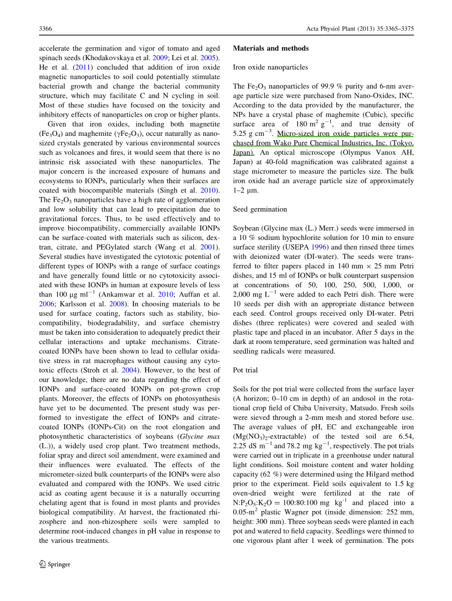 引言:纳米技术包括纳米粒子的合成,纳米材料的加工等。纳米材料的物理和化学性质与那些相同组成的块体材料的显著不同。它们具有大的比表面积和原子的相当大的比例可用于化学反应。各种研究报告都说明了纳米粒子对种子发芽和根伸长植物正面和的负面影响。据记载,银,金,钴和氧化锌纳米颗粒具有对种子发芽和洋葱,黄瓜的根伸长,和生菜的高抑制作用。表明,二氧化钛纳米颗粒具有对柳树屑蒸腾,生长以及其中的水利用效率具有显著的毒性作用。另一方面,发现多壁碳纳米管和纳米二氧化钛以适当的浓度,可以加速发芽和番茄和老化的菠菜种子活力。结论是,除了施加氧化铁磁性纳米粒子的土壤中可能会刺激细菌生长,改变细菌群落结构,这有利于土壤碳和氮循环。大多数这些研究的重点都集中在对作物或高等植物纳米颗粒的毒性和抑制作用。对于氧化铁,包括磁铁矿铁和磁赤铁矿,以及自然发生的各种环境资源,如火山爆发和火灾产生的纳米晶体,它们似乎是有关联的。主要关注的是米氧化铁增加对人类和生态系统的影响,特别是当它们的表面涂有生物相容的材料影响会更大。氧化铁纳米颗粒具有附聚和低溶解度的特性,由于重力可导致沉淀。因此,为了有效地使用,并改善生物相容性,市售纳米氧化铁可以是表面涂覆有材料例如硅,葡聚糖,柠檬酸盐和聚乙二醇化的淀粉。几项研究已经调查了不同类型纳米氧化铁的细胞毒性,并已普遍发现暴露水平在小于100 克每毫升对人体具有很小或没有细胞毒性。在选择将用于表面涂层材料时,应考虑很多因素,如稳定性,生物相容性,生物降解性,必须考虑到充分预测它们的细胞相互作用和吸收机制。柠檬酸涂层纳米氧化铁已显示导致鼠巨噬细胞的氧化应激,而不会引起任何细胞毒性作用。然而,据我们所知,有关于纳米氧化铁和表面包覆纳米氧化铁对盆栽效果还没有具体的研究。此外,纳米氧化铁对光合作用的影响还有待证明。所以我进行本研究以调查纳米氧化铁和柠檬酸涂层纳米氧化铁对大豆根伸长和光合特性的影响。两种施加方法,叶面喷施和直接的土壤改良剂,进行了检查,并他们的影响进行了评估。该纳米氧化铁的微米大小的影响也进行了评价,并与纳米氧化铁比较。我们使用柠檬酸作为包衣剂,因为它是在大多数植物中发现,并提供了生物相容的天然存在的螯合剂。在收获时,分馏根际和非根际土壤进行取样,以确定响应于各种处理中的pH值根诱导的变化。
