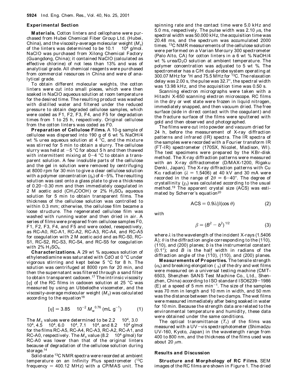 质量分数为29% 的乙二胺溶液在0°C下加入CdO,剧烈搅拌使其饱和,然后在5°C以下放置8小时。之后溶液在8000转速下离心20分钟,通过砂芯漏斗过滤得到清澈的镉乙二胺溶液。在25℃镉乙二胺溶液中RC膜的固有黏度eta;通过尤氏黏度计测量,而平均黏度分子质量(Meta;)通过以下公式算得。