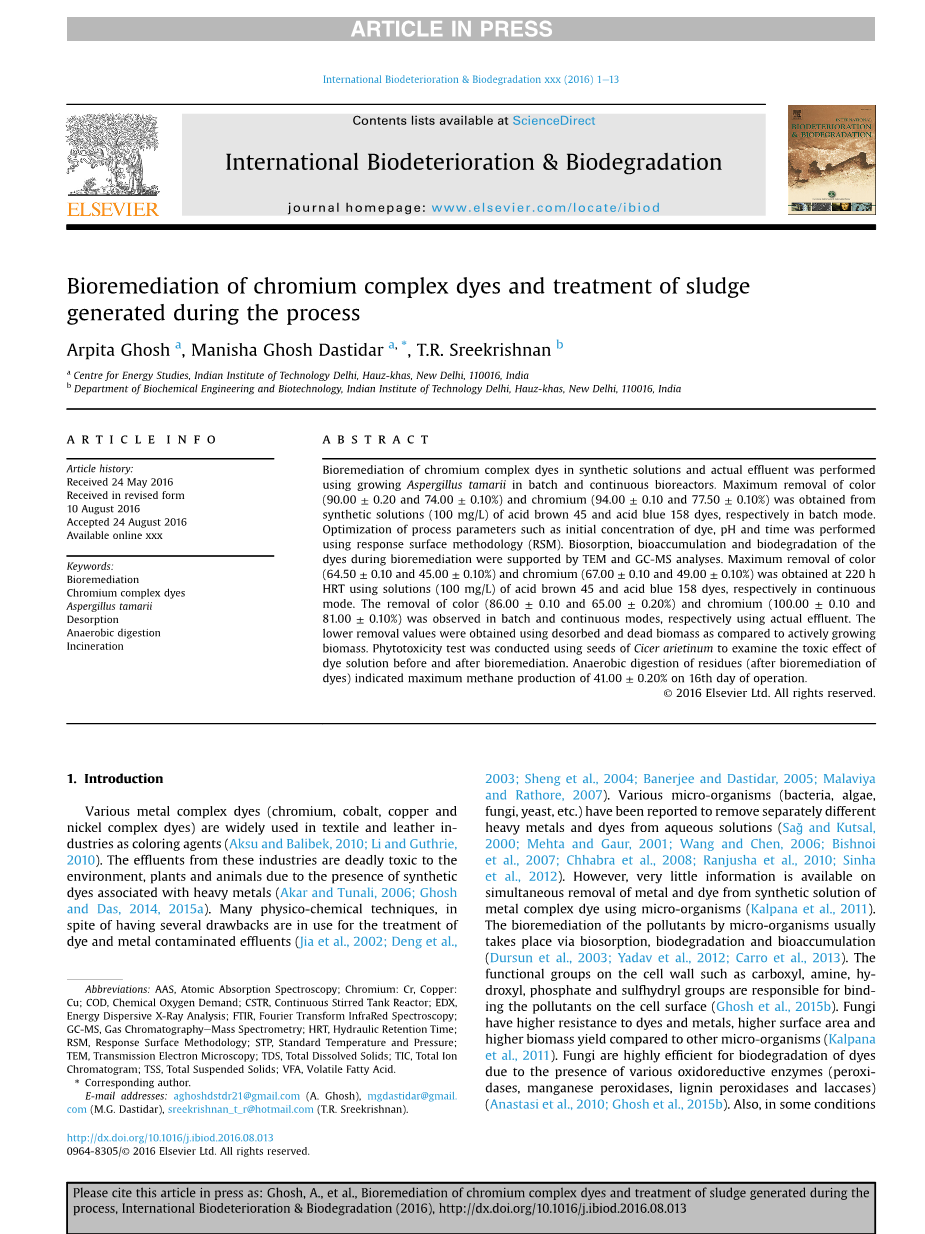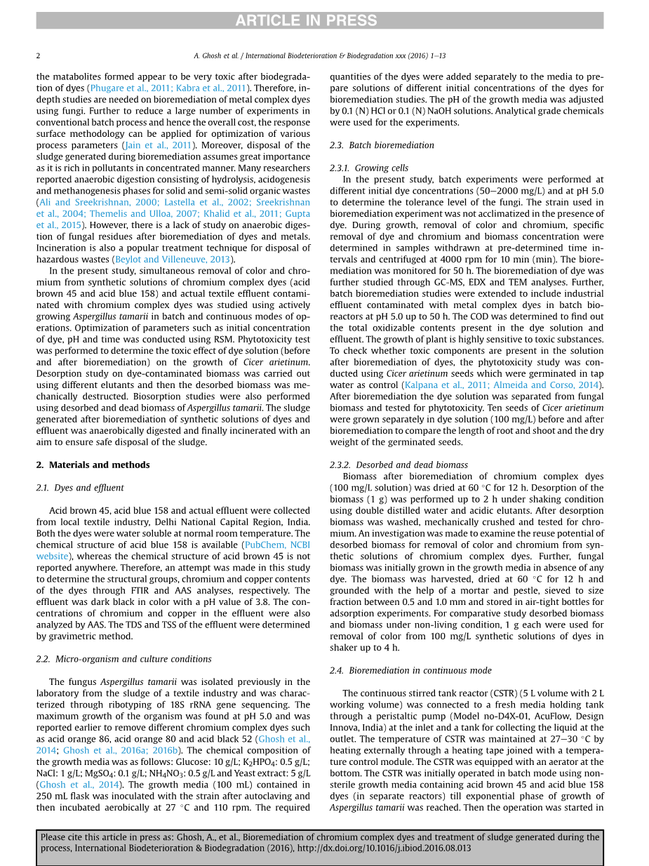 此外,为了减少常规分批过程中的重复实验,减少总体成本,响应面方法可用于优化各种工艺参数(Jain等,2011)。 因为污染物浓度较高,生物修复过程中产生的污泥处理十分重要,。 许多研究人员报道了固体和半固体有机废物的水解,酸化和甲烷生成阶段的厌氧消化(Ali和Sreekrishnan,2000; Lastella et al。,2002; Sreekrishnan et al。,2004; The melis and Ulloa,2007; Khalid et al。,2011; Gupta et al。,2015)。然而,在染料和金属生物修复后,缺乏对真菌残留物的厌氧消化研究。焚烧也是处理危险废物的普遍处理技术(Beylot和Villeneuve,2013)。在本研究中,在批次和连续操作模式下,使用有活力的曲霉曲霉(Aspergillus tamarii),从铬络合染料(酸性棕45和酸蓝158)的合成溶液中同时去除颜色和铬。并使用RSM进行染料初始浓度,pH和时间等参数的优化。 进行植物毒性试验以确定染料溶液(生物修复之前和之后)对鹰嘴豆的生长的毒性作用。使用不同的洗脱剂进行染料污染的生物质的解吸研究,然后将解吸的生物质机械破坏。 使用溜曲霉的解吸和死生物量进行生物吸附研究。 为了确保污泥的安全处理,染料和废水合成溶液生物处理后产生的污泥需要被厌氧消化,最后焚化。