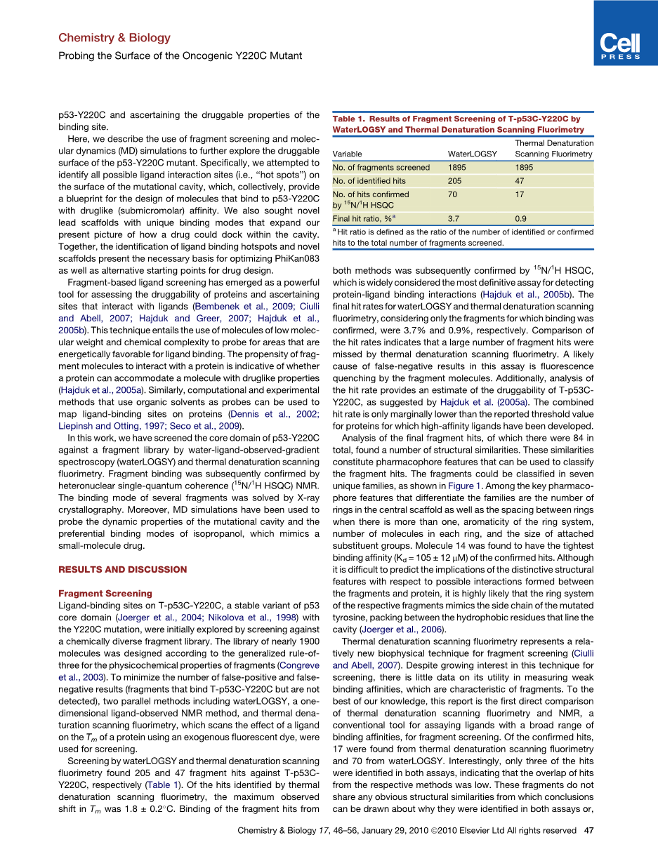 在T-p53C-Y220C上的结合位点,是一个Y220C突变体的稳定的p53的核心区域,最初是通过针对化学多样性片段文库进行筛选探讨的。近1900个分子的文库是根据片段的三个广义的理化性质设计的。为了最大限度地减少假阳性和假阴性的结果(即结合到T-p53C-Y220C但没有被检测到的片段),两个平行的方法被用于筛选,其中包括waterLOGSY一种一维配体观察的NMR法,和热变形荧光扫描这种方法是扫描外源性荧光染料蛋白配体在Tm上的作用。