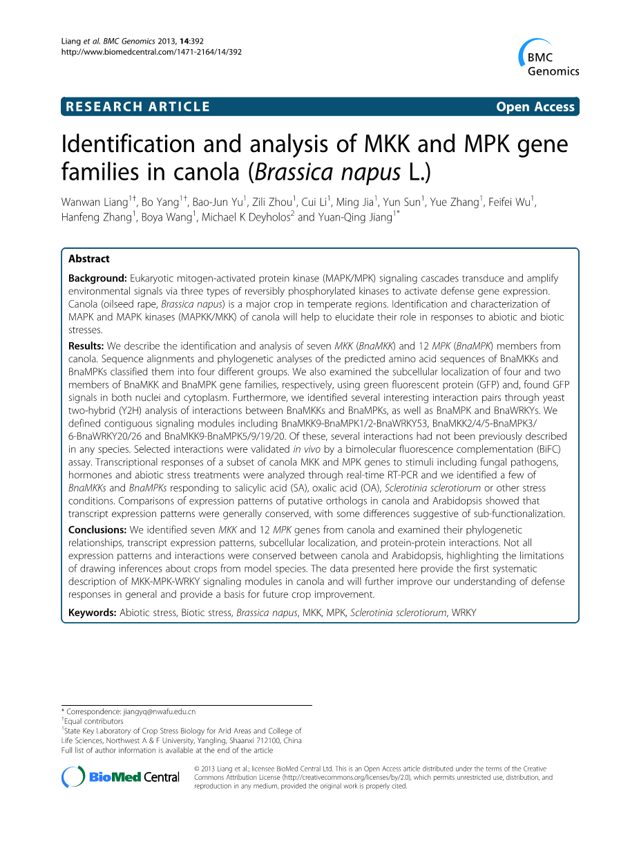 结论:我们确定了来自卡诺拉7个 MKK和12个 MPK基因,并检测了他们的系统发育关系,转录表达模式,亚细胞定位和蛋白质-蛋白质相互作用。发现并非所有的表达模式和相互作用在卡诺拉和拟南芥之间都是保守的,突出了从模式生物来推断相关作物的局限性。这里介绍的数据提供了对卡诺拉中MKK-MPK-WRKY信号组件的第一次系统描述,也将进一步改善我们对防御应答的理解以及提供了对未来的作物改良的基础。