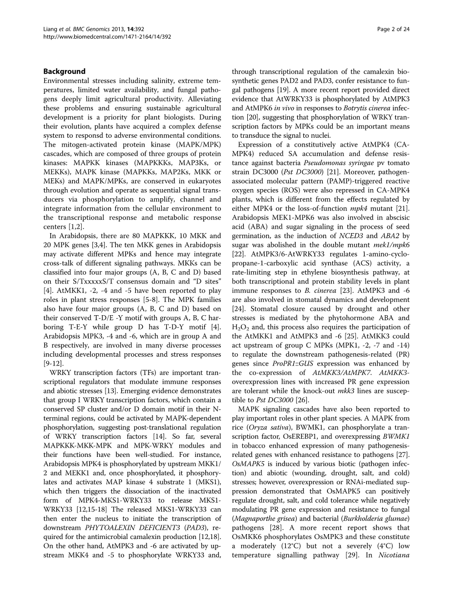 环境压力包括盐度,极端温度,有限的可利用水资源和真菌病原菌深深限制农业生产力。缓解这些问题和确保可持续农业发展是植物生物学家考虑的一个优先事项。在它们的发展过程中,植物已经获得一个复杂的防御系统对不利的环境条件进行应答。包括三组蛋白激酶:MAPKK激酶(MAPKKKs,MAP3Ks,或MEKKs),MAPK激酶(MAPKKs,MAP2Ks,MKK或MEKS)和MAPK/MPKs组成的有丝裂原活化的蛋白激酶(MAPK/MPK)级联,通过进化发展和连续的信号传导在真核生物中是保守的,该过程是通过磷酸化去扩增、传输和整合来自于细胞环境的信息到转录应答和代谢反应中心。