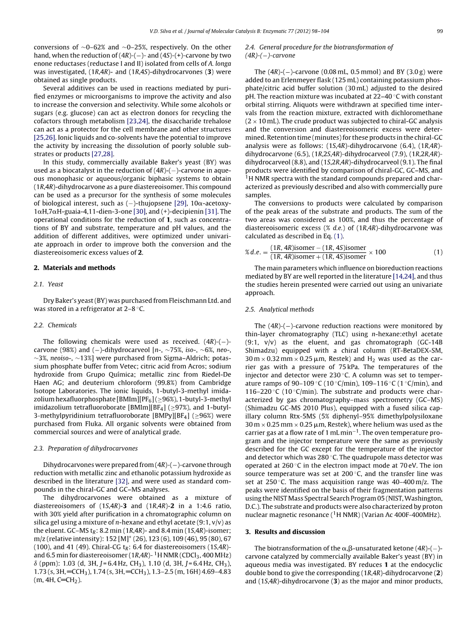 (1R,4R)-二氢香芹酮(2),一种重要的可再生基础材料,在水单相和双相体系中由面包酵母介导,通过还原(4R)-(-)-香芹酮(1)的不饱和碳碳双键可制备得到转化率良好和极好d.e.值的2。一些参量可以改变这个生物还原反应,如酵母浓度和底物浓度,温度,PH值,都可以被检测调查。在1生物转化的过程中加入不同添加剂的效果也可以被探讨。结果表示,转化率和d.e.值也主要取决于这些变量。最佳反应条件是100g/L的酵母,16.6mM底物,PH7.5,26℃,加入DMSO,海藻糖或蔗糖作为添加剂。在最佳条件下,获得的(1R,4R)-二氢香芹酮的d.e.值为92-99%,转化率为70-74%。