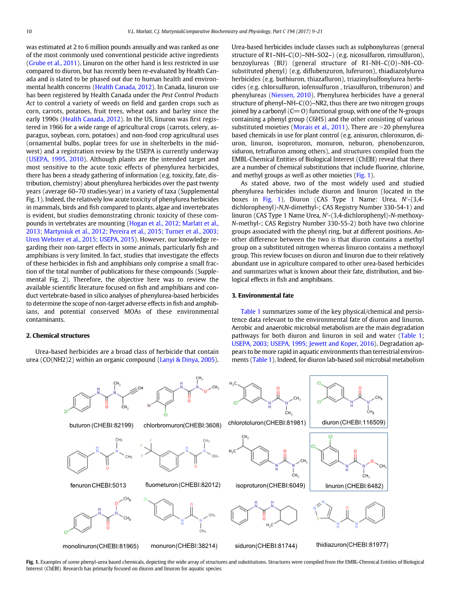 在美国,利谷隆于1966年首次注册了各种农作物(胡萝卜,芹菜,天竺葵,大豆,玉米,马铃薯)和非粮食作物农业用途(观赏植物,杨树,用于目前正在进行美国环保局的注册审查(美国环保局,1995年,2010年)。尽管植物是预期的目标并且对苯脲类除草剂的急性毒性作用最敏感,但在过去的二十年中,苯脲类除草剂的信息(例如毒性,归宿,分布,化学)得到了稳定的收集(平均60- 70个研究/年)在各种类群中(补充图1)。实际上,与植物,藻类和无脊椎动物相比,苯脲类除草剂在哺乳动物,鸟类和鱼类中的相对较低的急性毒性是显而易见的,但证明这些化合物在脊椎动物中的慢性毒性的研究正在增加(Hogan et al., 2012; Marlatt et al., 2013; Martyniuk et al., 2012; Pereira et al., 2015; Turner et al., 2003; Uren Webster et al., 2015; USEPA, 2015).然而,我们对某些动物,特别是鱼类和两栖动物的非目标效应的知识非常有限。事实上,研究这些除草剂在鱼类和两栖动物中的作用的研究只占这些化合物出版物总数的一小部分(补充图2)。因此,这里的目的是审查现有的科学文献,重点关注鱼类和两栖动物,并进行基于脊椎动物的苯基脲类除草剂的计算机分析,以确定鱼类和两栖动物的非目标不良反应的范围,以及这些环境污染物的潜在保守MOA。
