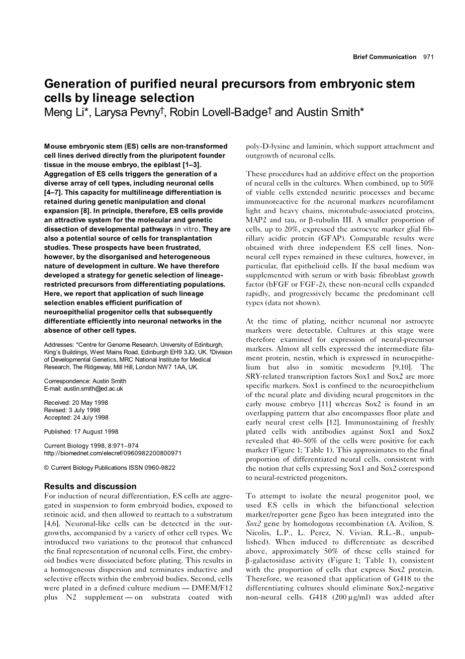 从胚胎干细胞中通过谱系选择分离纯化神经前体的研究外文翻译资料
