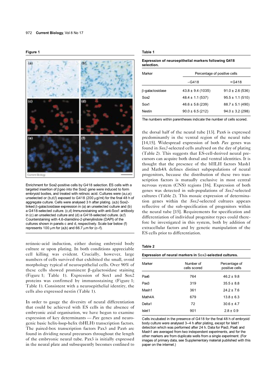 试图分离神经祖细胞池,我们使用的胚胎干细胞中,双选择标记/报道基因beta;geo通过同源重组已经融入了Sox2基因 (A. Avilion, S. Nicolis, L.P., L. Perez, N. Vivian, R.L.-B., unpublished)。当上述诱导分化,约50%的细胞染色beta;-半乳糖苷酶的活性(图1;表1),随着细胞表达Sox2蛋白比例一致。因此,我们推断,应用G418分化培养基应消除SOX2阴性的非神经细胞。G418(200微克/毫升)是添加维甲酸诱导后,在拟胚体培养或电镀。在这两种情况下明显的细胞死亡是显而易见的。然而,最重要的是,大量的细胞存活,表现出小的、卵圆形形态典型的神经上皮细胞。超过90%的细胞具有显著的beta;-半乳糖苷酶染色(图1;表1)。表达基因和Sox2蛋白经免疫组化染色(图1;表1)。与神经上皮的身份一致,细胞也表达了巢蛋白(表1)。为了衡量神经分化的多样性,胚胎干细胞在胚胎的轴向组织的情况下可以实现,我们已经开始研究表达的关键决定因素--Pax基因和神经核碱性螺旋-环-螺旋(bHLH)转录因子。paired-box转录因子Pax3和Pax6在分裂神经前体细胞胚胎神经管被发现。Pax3最初是表达在神经板,继而成为局限于神经管的背侧半【13】。Pax6基因主要在神经管的腹侧区表达【14,15】。两种Pax基因广泛表达在Sox2选定的细胞对电镀时间的分析时被发现(表2)。这表明,胚胎干细胞来源的神经前体可以获得背和腹的身份。普遍认为bHLH因子Mash1和Math4A定义不同的神经祖细胞亚群的存在,因为在大多数中枢神经系统的地区这2个转录因子的分布是相互排斥的【16】。在Sox2的选择培养物的亚群中检测到这两个基因的表达(表2)。在Sox2的选择培养物中确定基因的镶嵌表达出现反射在神经管sub-specification的祖细胞【15】。因此,在这个系统中进行调查个体祖细胞类型的规范和分化的要求,都应将细胞外因子的加入,并在胚胎干细胞分化前通过遗传操作。