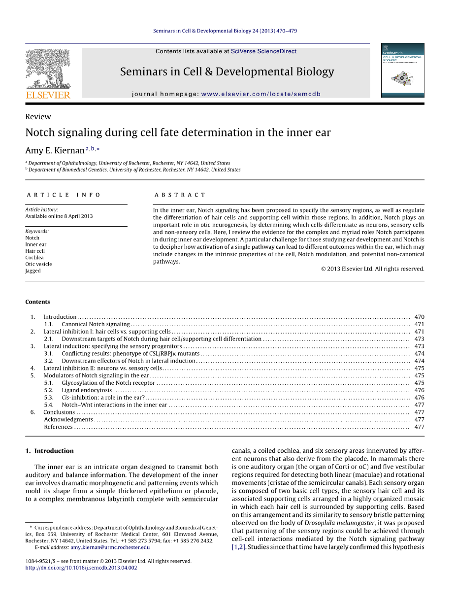 听觉器官和五个前庭需要检测线性(斑疹)和旋转区运动(半规管嵴)。每个感觉器官是由两种基本类型的细胞,感觉毛细胞和其安排在一个高度组织化的马赛克相关的支持细胞其中每个毛细胞是由支持细胞包围。基于这种布置和其相似的感官刷毛图案形成对果蝇的身体观察,有人提议感官区域的图案化可以通过以下方式实现由Notch信号传导途径介导的细胞 - 细胞相互作用[1,2]。自那时以来,研究在很大程度上证实了这一假设内耳发育过程中以及发现的缺口的新角色。在这里,我会检验对不同角色的证据槽口在内耳。Notch受体是单次跨膜蛋白是一个核心信号转导通路,具有高度的核心组成部分在所有后生动物物种的保护。由于配体也和膜结合,缺口近分泌介导的信号(信号相邻小区之间)。缺口调节的发展大多数器官和组织,和成体维持干细胞的和组织。在核心通路突变可以导致发育疾病,成人病,癌症[3]。在内耳,有证据已经积累了缺口在扮演多重角色包括基本的细胞类型的产生耳发展包括毛细胞,支持细胞和神经元。