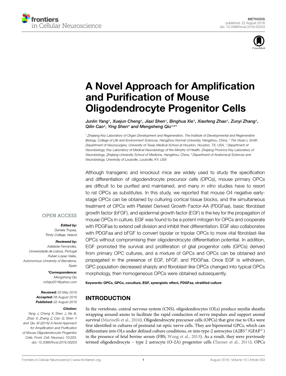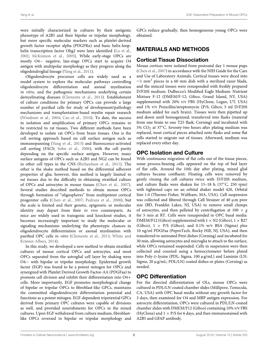 少突胶质前体细胞广泛用作模型系统,以探索体外控制少突胶质细胞分化和轴突髓鞘形成的分子途径,以及某些脱髓鞘疾病的致病机制(Clemente等人,2013)。建立原代OPCs的培养条件可以为研究发展/病理机制和基于移植的髓磷脂修复研究提供大量纯化的细胞(Windrem等,2004; Cao等,2010)。迄今为止,原代OPCs的分离和扩增成功仍仅限于大鼠组织。已经开发出两种不同的从脑组织中分离大鼠OPCs的方法。一种是基于细胞表面抗原的细胞分选方法,例如免疫抗体包被筛选法(Yang等,2013)和荧光激活的细胞分选(FACS; Sohn等,2006),其细胞纯度取决于特定的表面抗原。但是,在中枢神经系统的其他细胞类型中可以发现许多OPCs的表面抗原,例如A2B5和NG2(Richardson等,2011)。另一种是基于胶质细胞不同粘附特性的震荡方法。然而,由于难以在小鼠组织中获得OPCs和星形胶质细胞的分层培养物,这种方法在很大程度上限于大鼠组织(Chen等,2007)。多项研究描述了通过从多能皮层前体细胞中形成“寡聚体”获得小鼠OPCs的方法(Chen等,2007; Pedraza等,2008),但规模有限,其遗传、表观遗传或分子特性可能与体内的同类不同。由于小鼠广泛用于转基因和基因敲除研究中,因此在体外研究纯化的OPCs细胞对少突胶质细胞分化或轴突髓鞘形成表型的分子或信号传导机制变得越来越重要(Clemente等人,2013; White和Krauml;mer- 阿尔伯斯(Albers),2014年)。