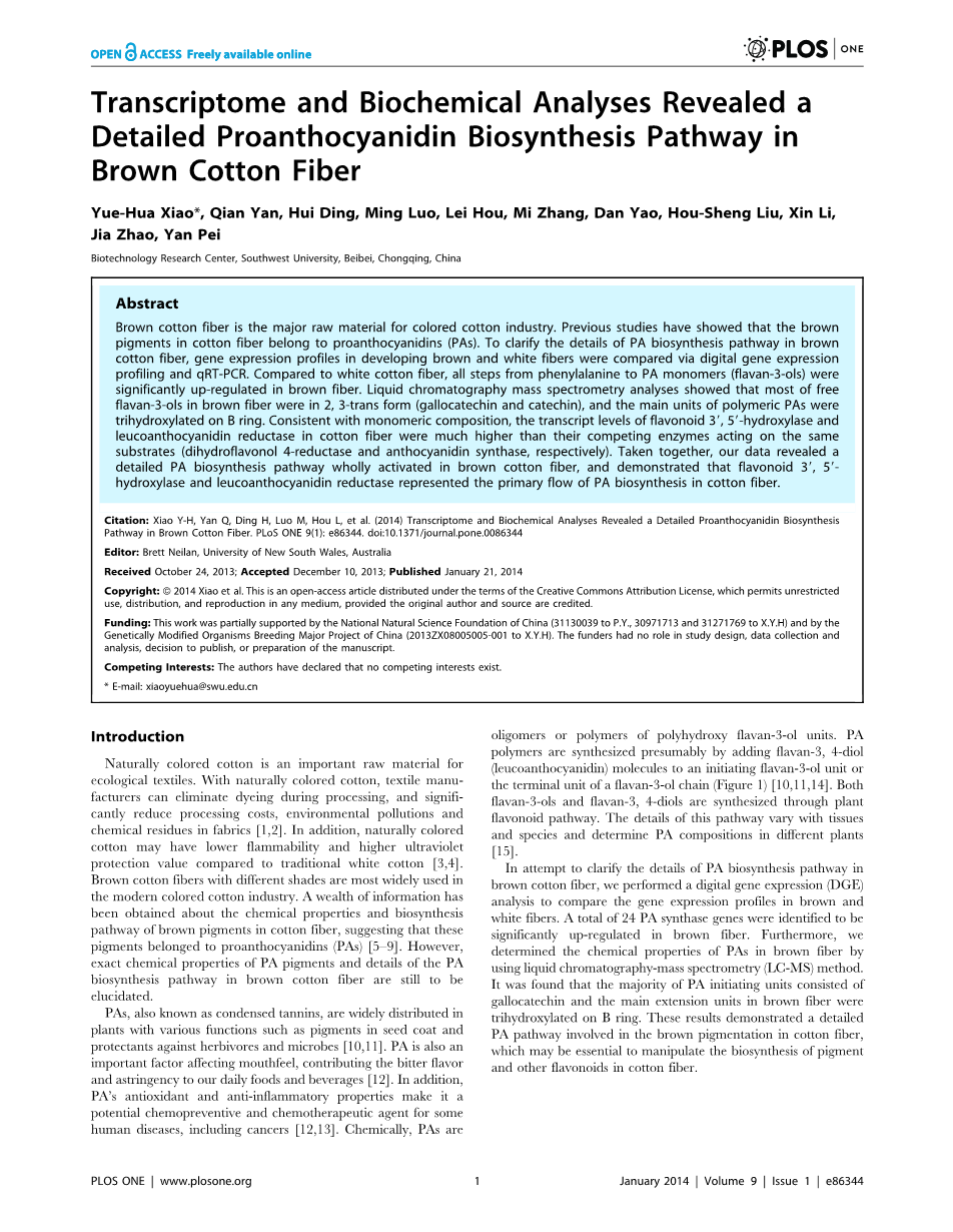 在试图澄清棕色棉纤维的生物合成途径的细节,我们进行了数字基因表达(DGE)分析比较在棕色和白色纤维的基因表达谱棕色和白色纤维中的基因表达谱。共有24个基因被鉴定为棕色纤维显著上调。此外,我们确定了PAS在棕色纤维化学性质采用液相色谱-质谱(LC-MS)方法。结果发现,PA的发起单位大多数包括儿茶素和主要推广单位棕色纤维三羟基B环。这些结果表明,在棉纤维的棕色色素沉着的详细的。这可能是一个基本的操控生物合成色素和其他黄酮类化合物棉纤维。