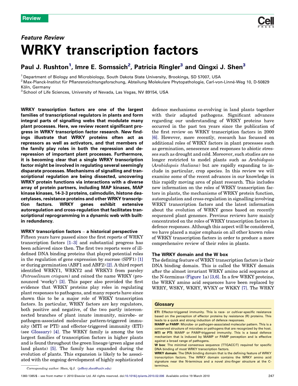 Paul J. Rushton1, Imre E. Somssich2, Patricia Ringler3 and Qingxi J. Shen3