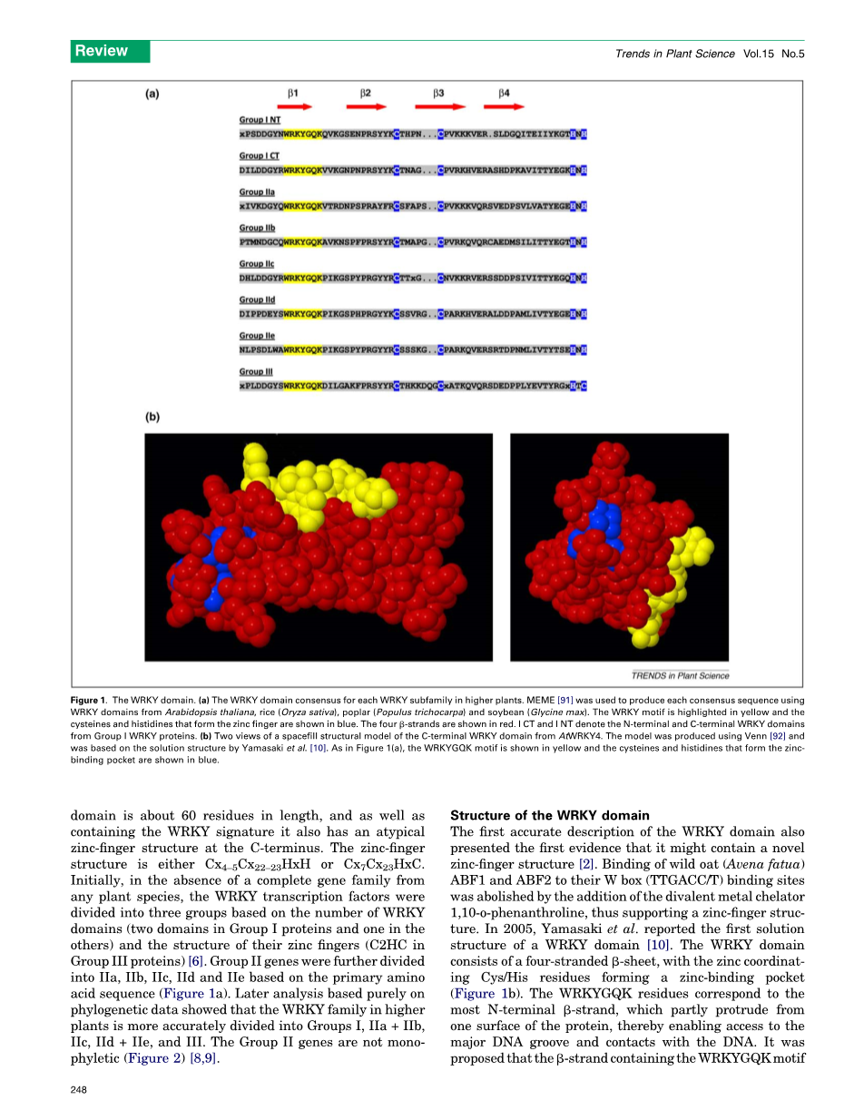 第一个准确的描述的结构域也提出的第一个证据,它可能包含一个新的锌指结构[2]。野燕麦(燕麦)结合ABF1和abf2其W盒(ttgacc / T)的结合位点由二价金属螯合剂添加取消1,10 -邻菲咯啉从而支持一个锌指结构。2005山崎等人,是第一个解决方案一个结构域的结构[10]。WRKY结构域由一四股的beta;-折叠,与锌协调半胱氨酸/他的残基形成锌结合口(图1B)。的WRKYGQK残基对应的最末端的B股,这部分突出一个表面的蛋白质,从而使访问的主要的脱氧核糖核酸槽和接触。它是提出了含有WRKYGQK母题的B股将约6bp的区域接触,这与宽框的长度是一致的[10]。晶体的C-末端结构域的结构atwrky1表现出类似的结构与一个额外的B股四的N-末端,变得很明显,因为域使用长[11]的WRKY结构域股份的NAC和GCM相似脱氧核糖核酸结合结构域,这导致了这一命题WRKY和GCM域是进化的关系[10,12]。WRKY和GCM锌指在锌结合基序的相似之处,但标志从GCM蛋白缺失WRKYGQK签名。这些相似性如何有意义是值得怀疑的由于结构域似乎比更多的祖先GCM的域,以及两者之间的关系是植物王国以前的进化史不同于其他真核植物王国[10]。