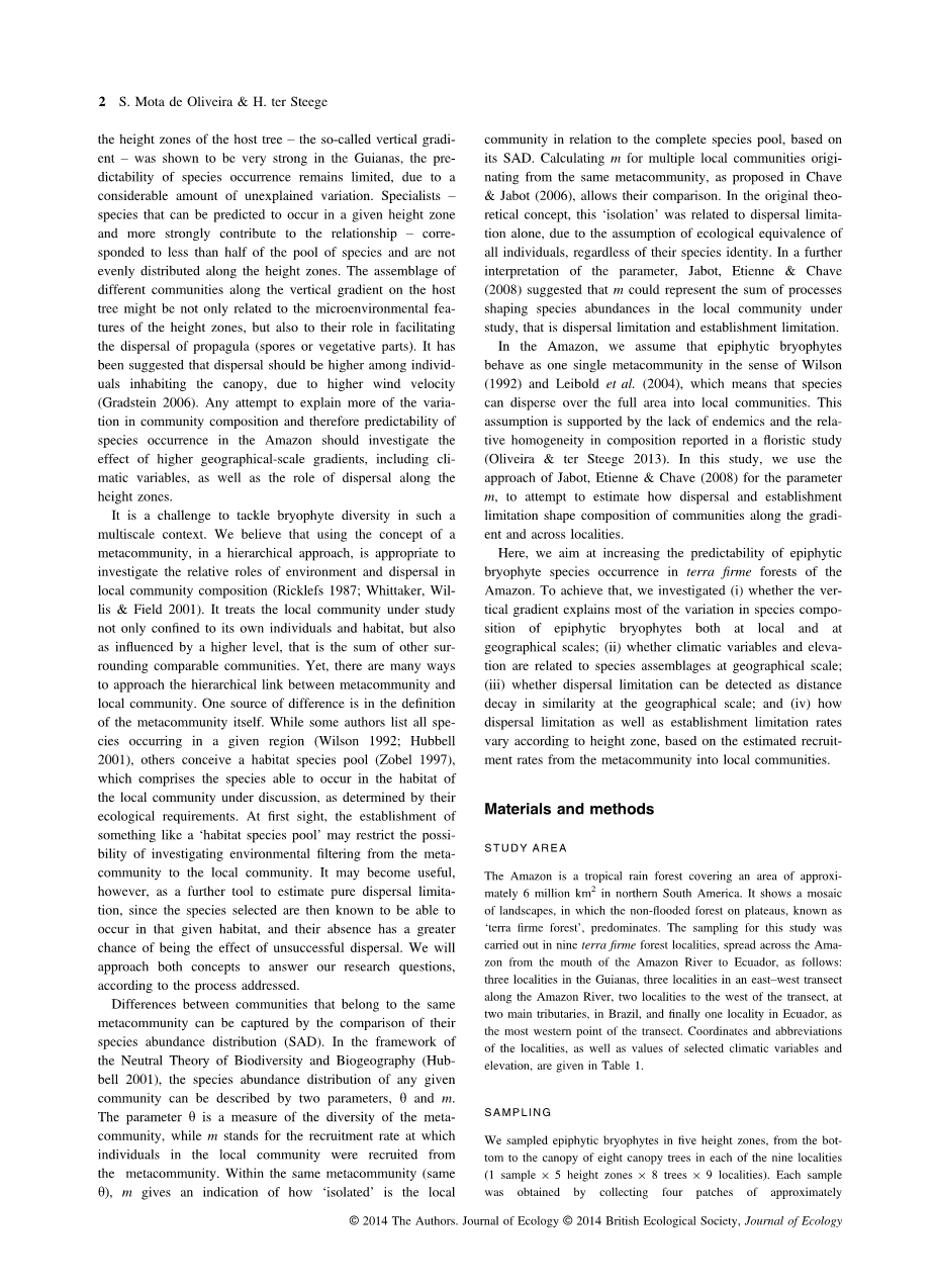 在亚马逊地区,我们假设附生苔藓植物表现为一个单一集群,这意味着物种可以分散成为局部的群落。在这项研究中,对于参数m,我们采用Jabot, Etienne amp; Chave (2008)的方法,试图估计分散和建立限制如何形成沿梯度和各地区的群落组成。