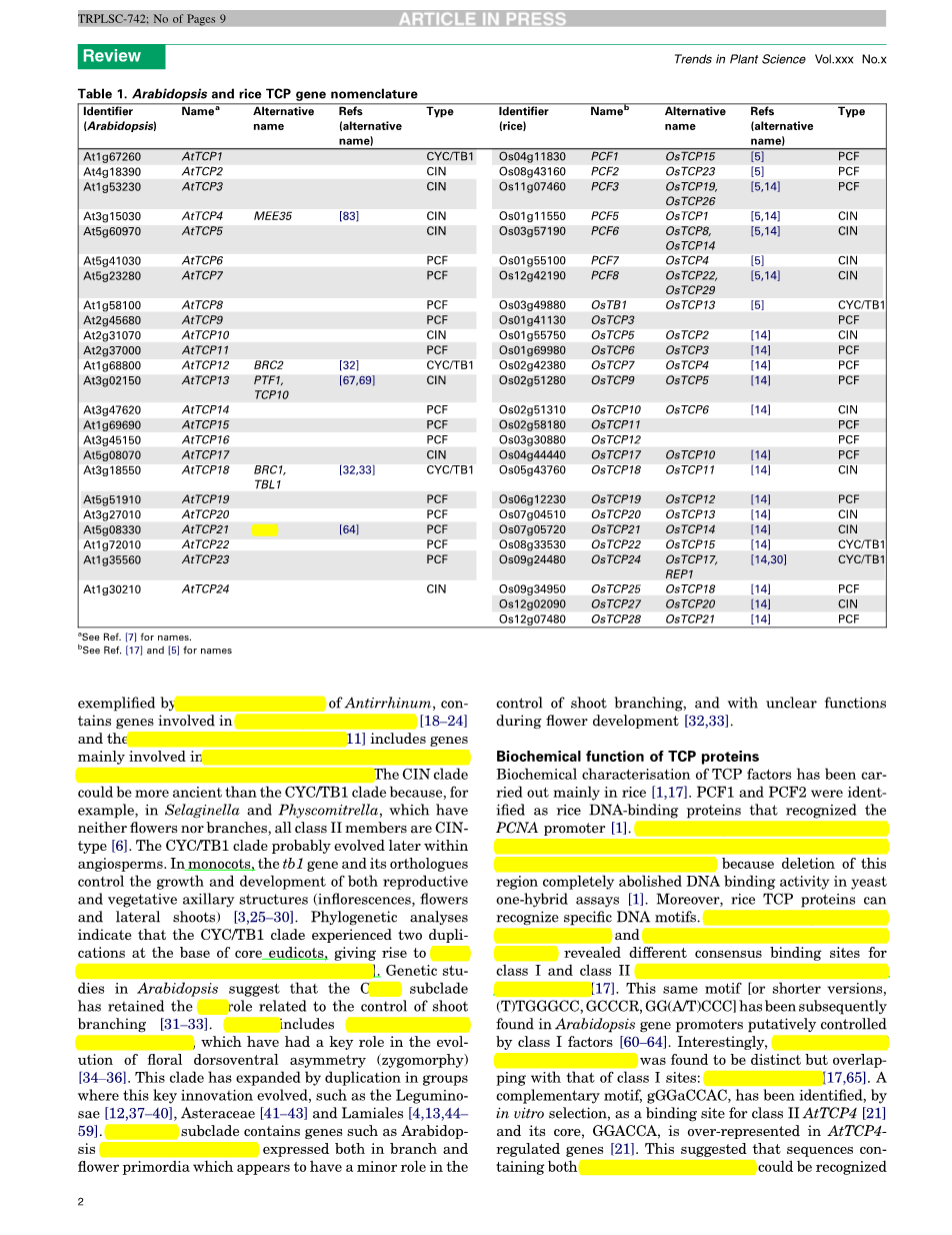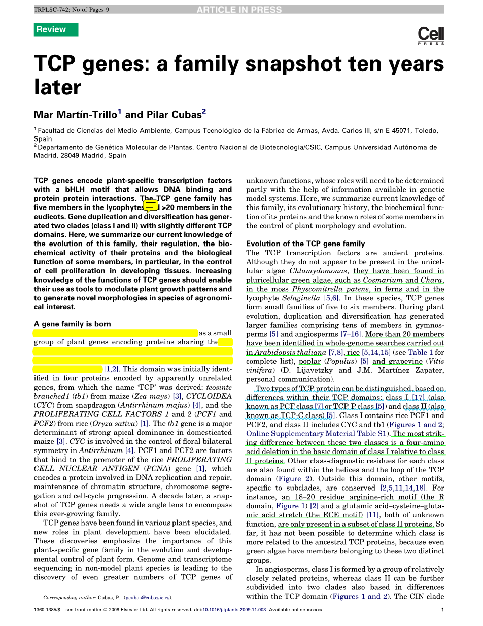 TCP基因编码植物特有的转录因子,具有一个bHLH模体可使DNA结合和蛋白质之间相互作用。 TCP基因家族在石松类植物里有五名成员,在真双子叶植物中有大于20名成员。基因的复制和多样化使这个家族生成不同的两个分支(I类和II类),两种分支具有略为不同的TCP域。在这篇文章里,我们总结了我们目前掌握的TCP基因家族进化的情况、他们的规律、这些蛋白的生物化学活性和一些家族成员的生物学功能,值得一提的是它在分生组织中可以控制细胞增殖。了解TCP基因的功能,我们就能把它作为一种工具,用以调节植物的生长模式和在农艺方面调节成我们需要的形态。