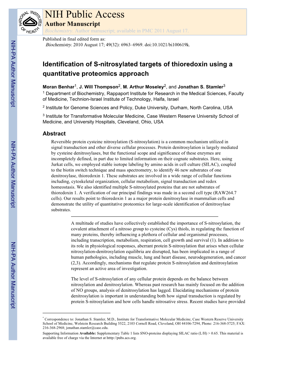 Moran Benhar1, J. Will Thompson2, M. Arthur Moseley2, and Jonathan S. Stamler3