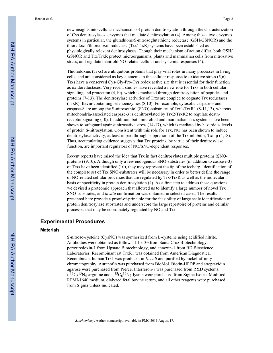 最近有报道提出,实际上Trx使多种蛋白(SNO蛋白)发生脱亚硝基化。虽然有少数的内源性SNO-底物(除Caspase-3外)的Trxs基因已被确定,但这只是冰山一角。Trx SNO—底物的完整识别是为了定义受Trx/TrxR以及脱亚硝基化蛋白特异性分子组成的NO—相关的细胞过程。作为解决这些问题的第一步,我们设计了一种蛋白质组学方法来鉴定大量新型Trx SNO—底物,在选定的情况下当场得到验证。结果显示,蛋白质脱亚硝基化蛋白底物和细胞过程的大量识别有一个原理证明,这可能受NO和Trx协调调节。