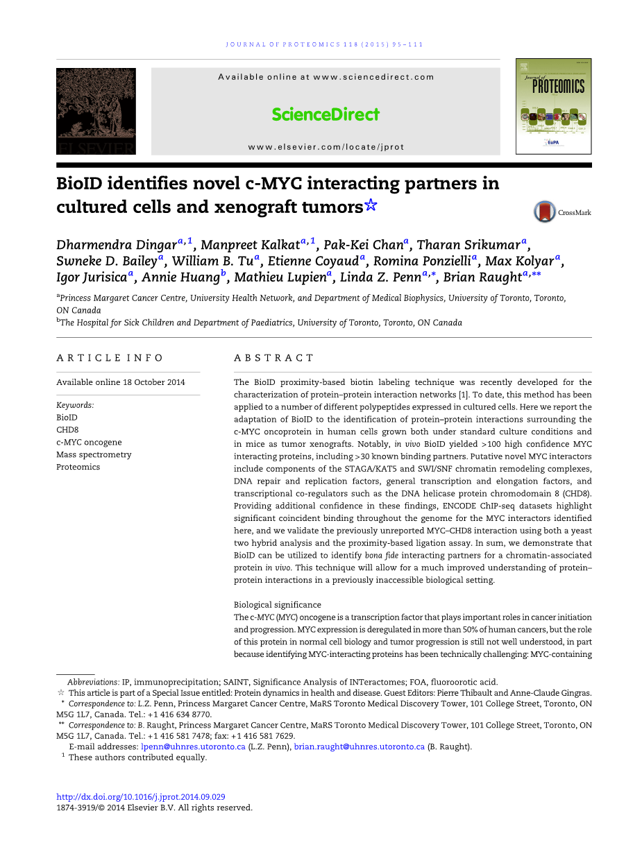 BioID这个接近型生物素标记技术最近用于表征蛋白和蛋白之间相互作用网络,迄今为止,该方法已被应用于培养细胞中大量不同多肽的表达。这篇文章中我们论述了BioID对人体细胞中c-MYC致癌基因周围相互作用蛋白的鉴定在标准培养条件和在小鼠体内作为移植癌生长的适应。值得注意的是,在体内BioID产生大于100个高信度MYC相互作用蛋白,包括大于30个已知的结合配体。新型MYC相互作用子包括STAGA / KAT5和SWI / SNF染色质重塑复合物的成分,DNA修复和复制因素、一般转录和延伸因子以及转录共调节因子如DNA解旋酶蛋白染色体8(CHD8)。这些发现给了我们很大的信心,ENCODE ChIP-seq数据集中显示出MYC相互作用子在整个基因组鉴定中很巧合的连接在一起,并且我们使用酵母双杂交分析和基于邻近的连接测定来验证以前未知的MYC-CHD8相互作用。总的来说,我们证明BioID可用于识别体内染色质相关蛋白的真正相互作用的配体。这个技术可以提高我们对蛋白质之间相互作用的理解,因为在这之前还没有方法能解决这个问题。