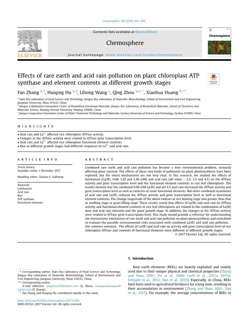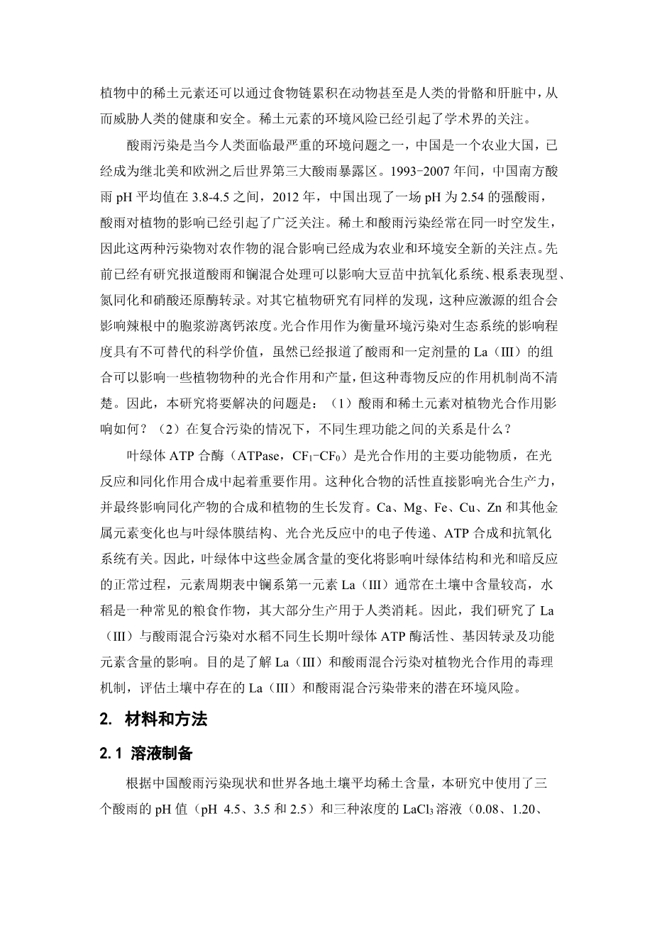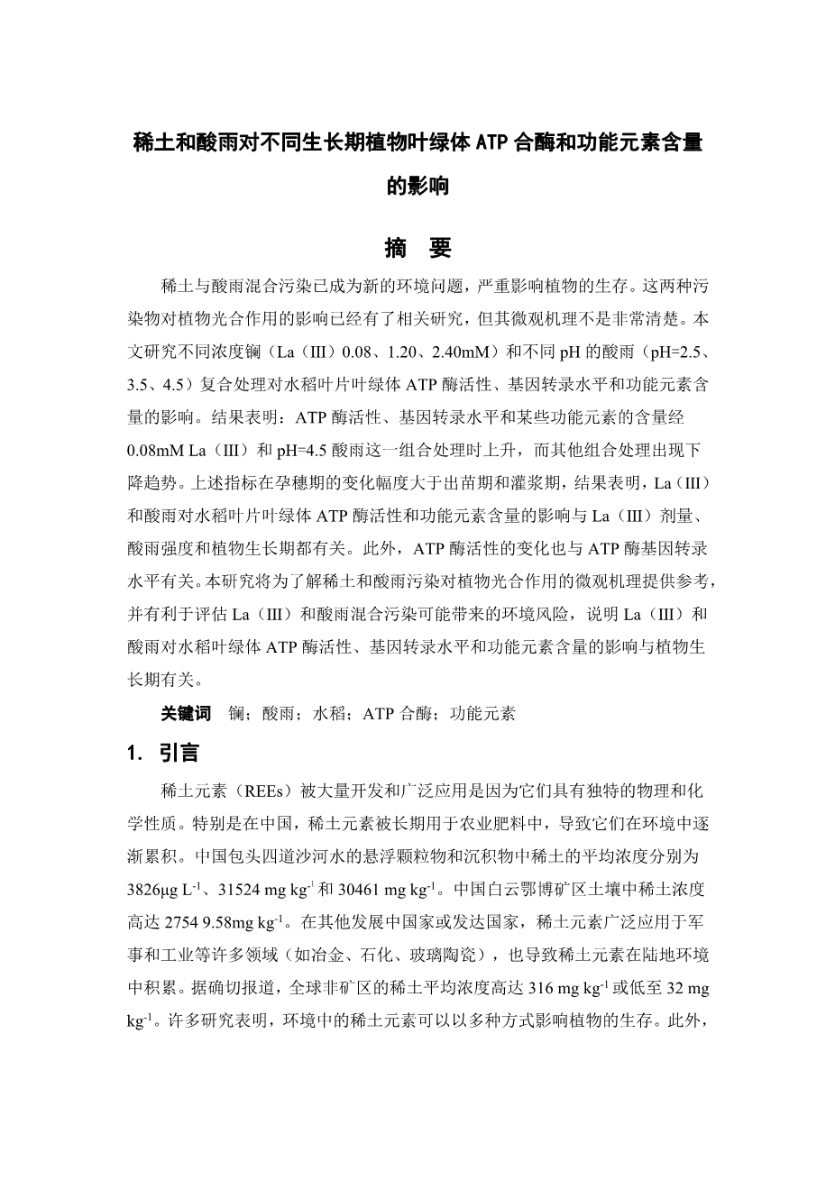 稀土和酸雨对不同生长期植物叶绿体ATP合酶和功能元素含量 的影响外文翻译资料