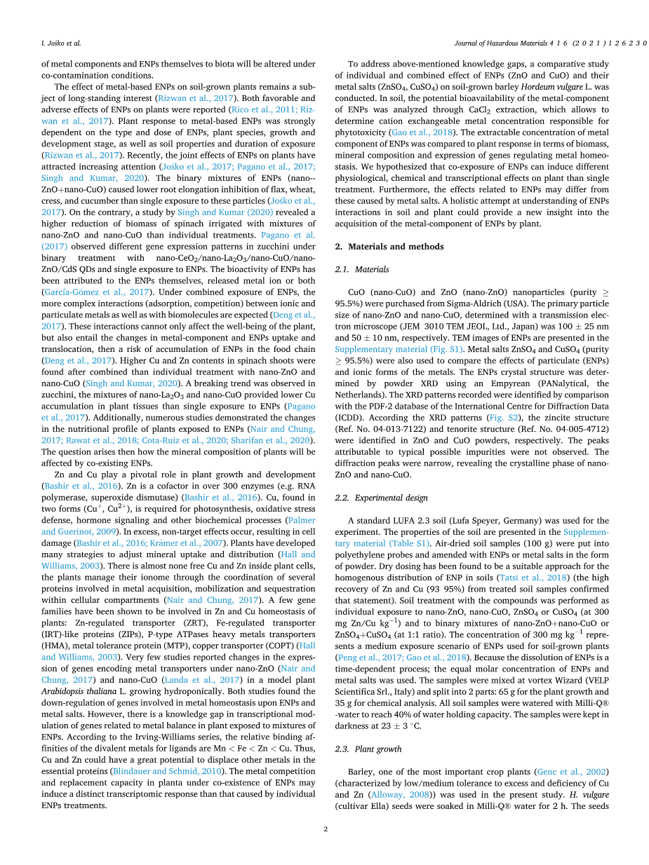 纳米氧化铜和纳米氧化锌在植物相关系统中的联合效应:从土壤中的生物利用度到大麦中金属平衡的转录调节外文翻译资料