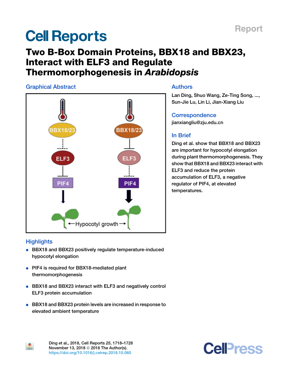 摘要:植物的生长和发育过程与各种内源信号和环境挑战相协调。光敏色素互作因子 4(PIF4)在拟南芥的热响应基因表达和下胚轴生长中起着重要的积极作用,而early flowering 3(ELF3)在高温下负向调控PIF4的活性。然而,在温暖条件下,ELF3的活动是如何调节的还不清楚。在这里,我们报告鉴定B-box 18(BBX18)和BBX23作为拟南芥中重要的热形态发生调控因子。BBX18和BBX23突变导致热响应性下胚轴伸长减少。相反,高温条件下BBX18过表达促进下胚轴的生长,这取决于PIF4或 constitutive photomphogenic 1(COP1)。BBX18和BBX23与ELF3或COP1相互作用。在正常和温暖条件下,敲除BBX18和BBX23会增加ELF3丰度。在PIF4突变体和BBX18/BBX23双突变体中,多个热响应基因的表达均受损。因此,我们的发现揭示了B-box蛋白在热形态发生过程中的重要作用,并为我们理解温暖温度信号如何调节ELF3活性和PIF4依赖基因提供了见解。