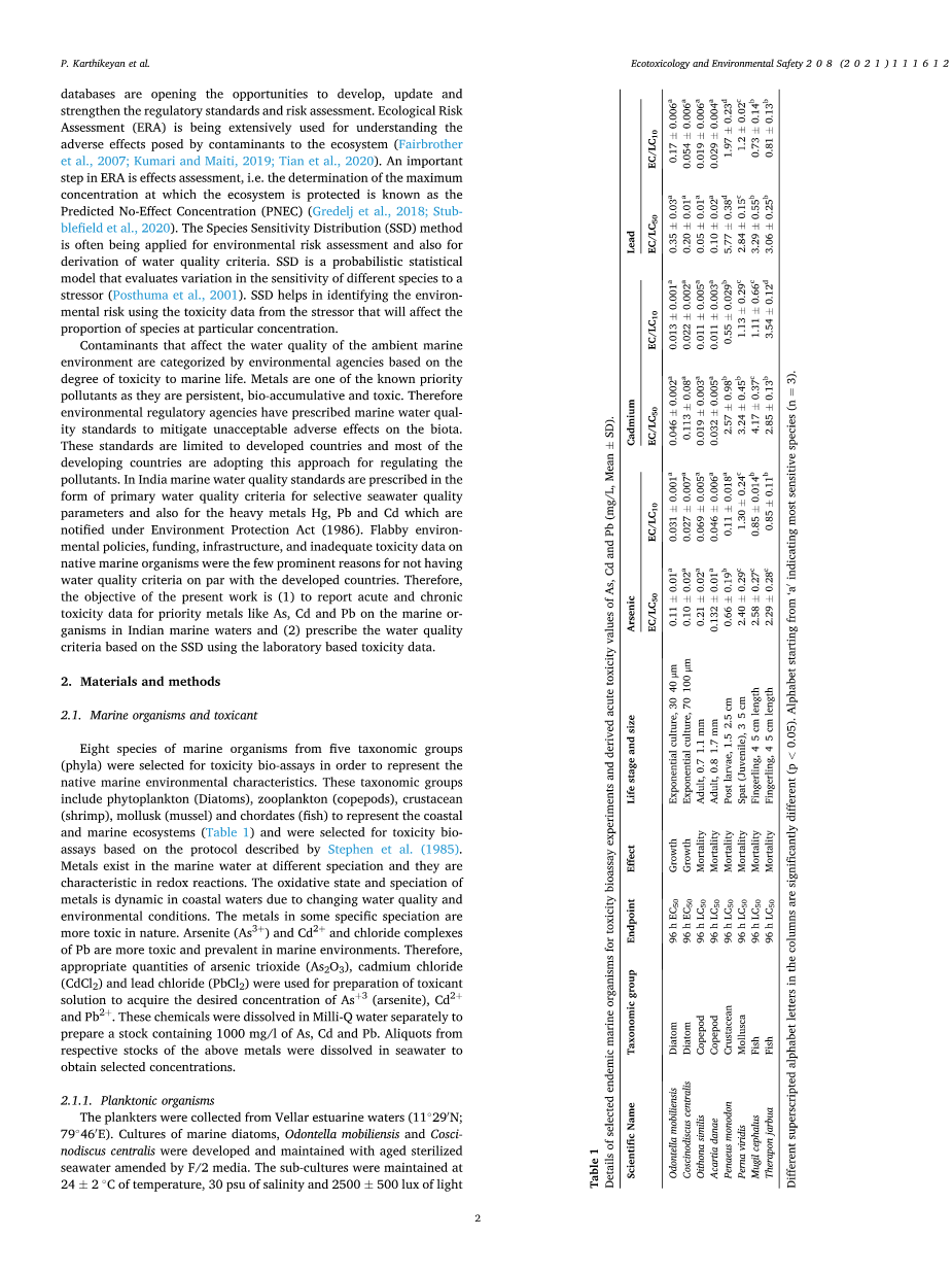 影响海洋环境水质的污染物由环境部门根据对海洋生物的毒性程度进行分类。金属是所知的优先污染物之一,因为它们具有持久性,生物累积性和毒性。因此,环境监管机构已制定海洋水质标准,以减轻对生物群的不可接受的不利影响。这些标准仅限于发达国家,大多数发展中国家正在采用这种方法来调节污染物。在印度,海洋水质标准以选择性海水水质参数的主要水质标准以及根据“环境保护法”(1986年)通报的重金属Hg,Pb和Cd的形式规定。关于本地海洋生物松弛的环境政策,资金,基础设施和毒性数据不足是导致水质标准与发达国家不符的几个主要原因。因此,本工作的目的是(1)报告在印度海域海洋生物中,As、Cd和Pb等优先金属污染物的急性毒性数据和慢性毒性数据;(2)根据SSD法用实验毒性数据规定水质基准。