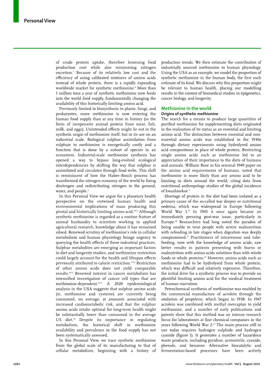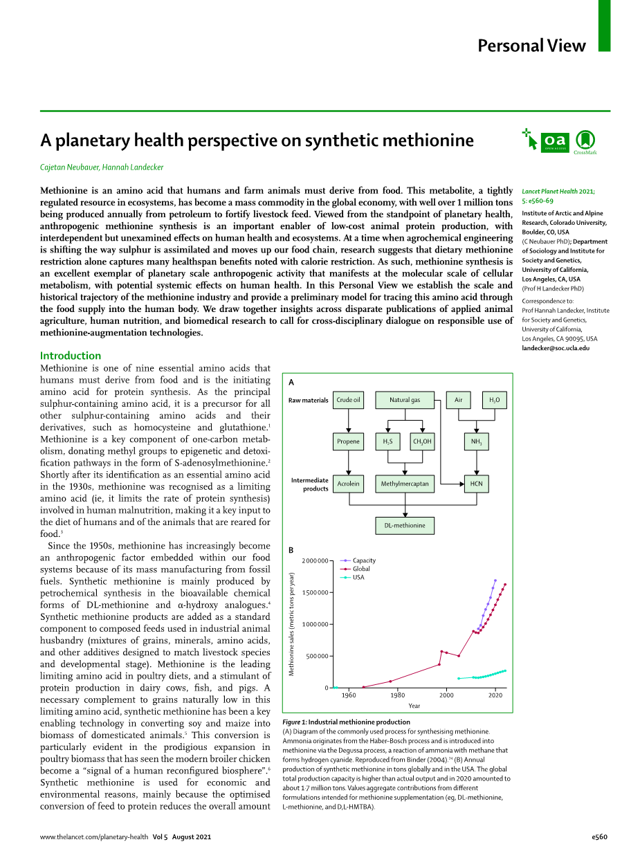 从个人观点来看,我们主张从全球性健康的角度来看待大规模生产这种关键的、历史上限制性的氨基酸对人类健康和环境的影响10,11。虽然对从事农业应用研究的科学家来说,合成蛋氨酸被视为畜牧业的常规特征,但有关它的知识仍然很贫乏。对蛋氨酸在细胞代谢和人体生理中作用的重新审视,使人们对这些工业实践的健康效应产生了迫切的质疑。硫代谢物正在成为饮食和寿命研究中的重要因素,限制蛋氨酸可以在很大程度上解释之前由于热量限制而产生的健康和寿命影响12,13。限制其他氨基酸不能产生可比的结果14,15。对癌症代谢的重新关注加强了依赖蛋氨酸的癌细胞类型的研究16,17。美国2020年的一项流行病学分析表明,含硫氨基酸(即蛋氨酸和半胱氨酸)目前的平均消费量与心脏代谢风险增加有关,并且最适合长期健康的含硫氨基酸摄入量可能大大低于美国平均饮食中的消费量18。尽管蛋氨酸在调节新陈代谢方面很重要,但尚未系统地评估蛋氨酸供应量和流行率的历史变化。