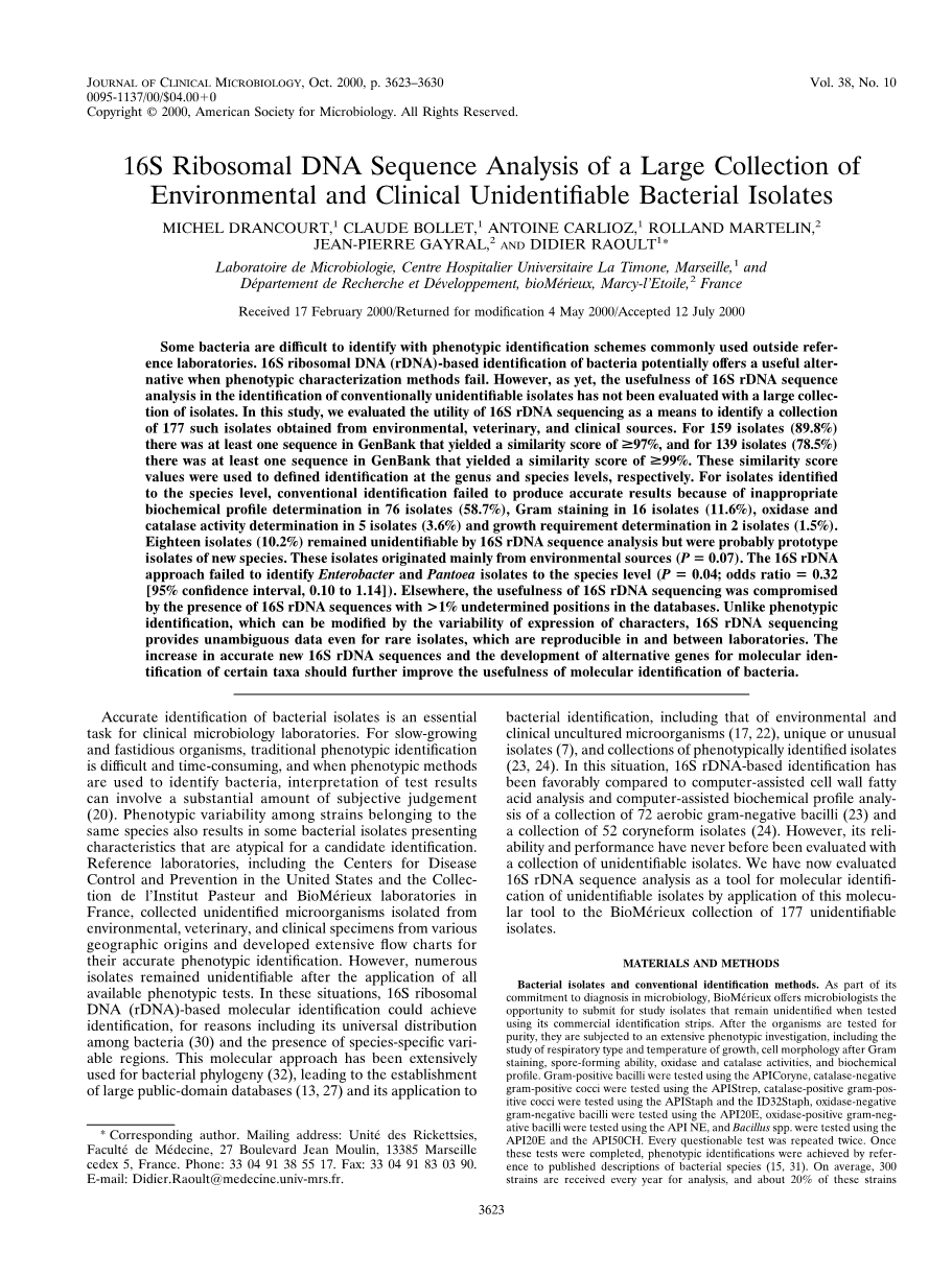 我们现在已经评估了16S rDNA序列分析作为一种工具,通过应用该分子工具对177个无法识别的菌株的BioMerieux集合进行分子鉴定。