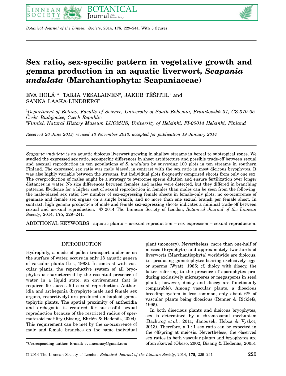 摘要:波瓣合叶苔是一种水生的叶状苔类植物,生长在北亚热带的浅水溪流中。通过对芬兰南部10条河流100块地的调查,研究了波瓣合叶苔的表达性别比、芽结构的性别差异以及有性生殖和无性生殖之间可能的平衡。表达的性别比为雄性偏倚,与大多数雌雄异株苔藓植物的性别比相反。在不同的溪流之间也有很大的差异,但是单独的地块通常只有一个性别的嫩枝。雄性的过度繁殖可能是一种策略,以克服精子稀释,并确保在较长距离的水中受精。没有发现雌性和雄性之间的大小差异,但它们在分支模式上有所不同。雌性的性生殖成本高于雄性的证据可以从以下几个方面看到:雄性偏倚的性别比;在只有雌性的情节中,性表达的雌芽数量少;在同一枝上没有生殖器官和雌性生殖器官同时出现,每枝上也没有一个以上的生殖器官。相反,雄性和雌性的高芽孢产量表明有性生殖和无性生殖之间的最小平衡。伦敦林奈学会,林奈学会植物学期刊,2014,175,229 - 241。