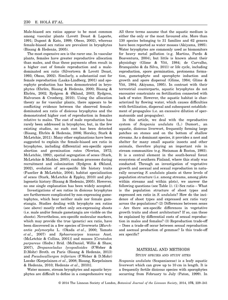 在这篇文章中,我们讨论的是Scapania undulata (L)Dumort. 生殖系统,一种水生的、双叶的苔类植物,经常在石头上和浅溪底部形成大块状。作为优势种,它为许多小型水生昆虫和其他动物提供了巢穴和庇护所,因此在溪流群落中扮演着重要的角色(如Steinman amp; Boston, 1993)。它是芬兰南部南北方森林生态系统的中心元素,本研究就是在那里进行的。通过对自然生长的波瓣合叶苔在3个群体结构水平(溪流间、溪流内地块间、地块内地块间)上的营养生长、无性繁殖和有性繁殖的调查,我们回答了以下问题(见表1)。(1)性别比例: 波瓣合叶苔的种群结构和表达的性别比例是什么?在不同的群落中,芽的类型和表达的性别比例是否不同?(2)性别差异:营养生长性状和芽结构是否存在性别特异性差异?如果是的话,这是否可以用雄性和雌性的性繁殖成本差异来解释呢?(3)生殖平衡-有性生殖和无性生殖之间是否存在平衡?这种权衡是特定于性别的吗?