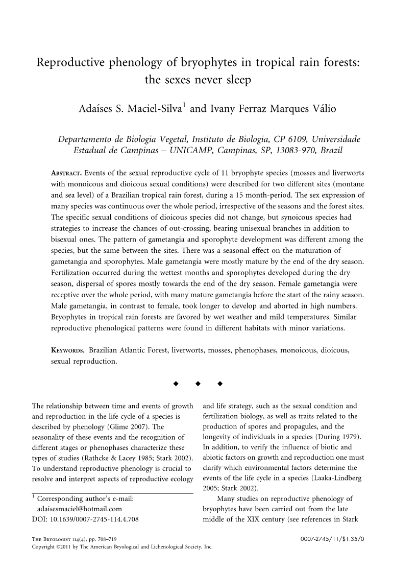 总体目的是描述巴西热带雨林两个不同地点(山地和海平面)的11种苔藓和苔类植物(具有雌雄同体和雌雄异株性条件的苔藓和苔类植物)在15个月内的有性生殖周期事件。我们提出了以下问题:(1)两个地点的所有物种的性表达是否在一年内都是连续的?(2)物种和地点之间的特定性条件是否不变?(3)在配子体发育和孢子体发育方面,两个位点和种之间是否存在差异?
