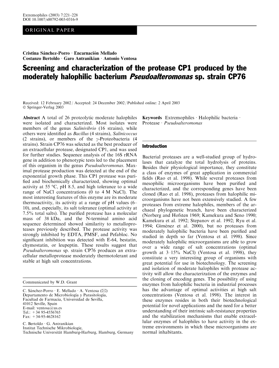 作者:C Saacute;nchez-Porro,E Mellado,C Bertoldo,G Antranikian,A Ventosa
