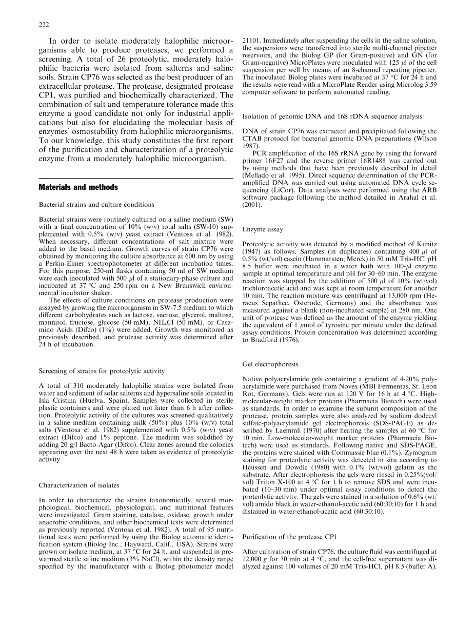 从Isla Cristina (Huelva, Spain)的水、太阳能盐场和高盐度的土壤底泥中总共分离得到310株中度嗜盐菌。在采集标本后的6小时内,要其放置在无菌塑料容器并接种。为了定性筛选出蛋白水解活性高的菌株,将其放入加入了0.5%(w/v)酵母提取物(Difco)和1%蛋白胨的盐培养基。并加入20g/l细菌,然后用琼脂(Difco)固化培养基。