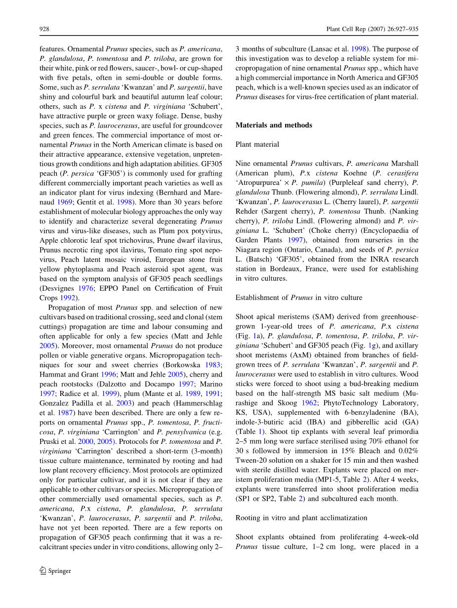 大多数李属的传播与新品种产生是靠传统的杂交,种子和克隆(扦插)繁殖而来。这样做费时费力,且往往只适用于少数品种(Matt and Jehle, 2005)。此外,最具观赏性的李属植物几乎不产生花粉或能成活的生殖器官。关于于酸樱桃和甜樱桃(Borkowska 1983;Hammat and Grant 1996; Matt and Jehle 2005),樱桃和桃砧木(Dalzotto and Docampo 1997; Marino 1997; Radice et al. 1999),李(Mante et al. 1989, 1991; Gonzalez Padilla et al. 2003),樱桃(Hammerschlag et al. 1987)的快繁技术已有描述。观赏李属只有少数被报道,如野生毛樱桃、金露梅、卡林顿樱桃(e.g.Pruski et al. 2000, 2005)。曾报道过一个短期(3个月)的关于野生毛樱桃和卡林顿樱桃的组织培养方案,结果由于其生根和植物恢复效率低下而终止。大多数方案仅对特定品种进行优化,并不能明确适用于其他的品种或种类。其他用于商业的观赏品种的快繁方法尚未报道,如美国李、紫叶沙樱桃、腺叶李、石楠樱、桂樱、日本晚樱和榆叶梅。一些关于法国樱桃GF305的报告证实在体外条件下顽抗的品种只允许2-3个月的传代培养(Lansac et al. 1998)。本次研究的目的是开发一个关于九个观赏李属和法国樱桃GF305的快繁体系,前者已在北美具有高商业价值,后者作为一个众所周知的作为李属疾病指标的物种,用于植物材料的脱毒认证。