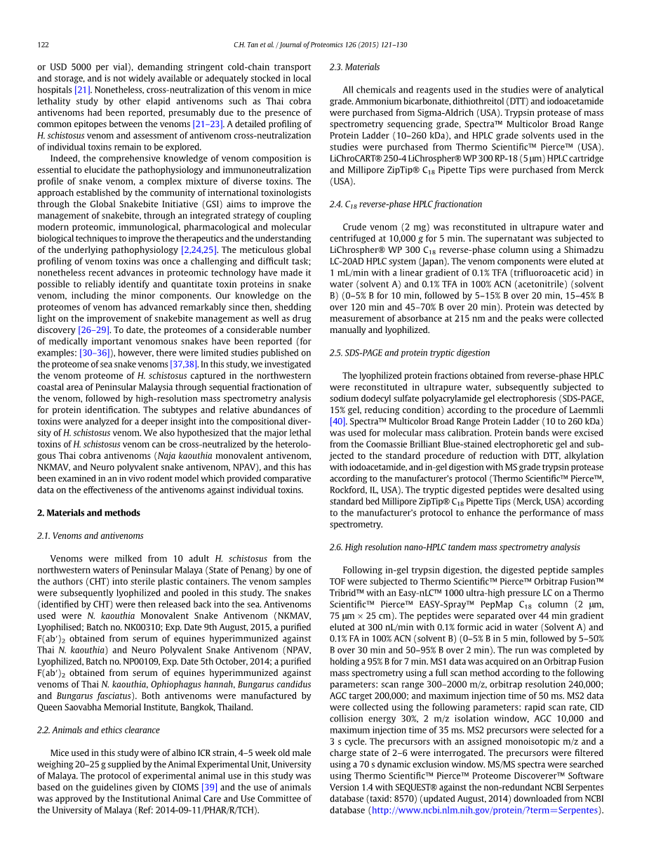 蛇毒由CHT的其中一位作者从马来亚(槟州)半岛西北水域中的10条成年剑吻海蛇中提取所得。将蛇毒置于无菌的塑料容器内,随后将蛇毒样品冻干并收集。然后将蛇(由CHT鉴定)释放回海中。所使用的抗蛇毒血清是孟加拉眼镜蛇(N. kaouthia)单价抗蛇毒血清(NKMAV,冻干;批次NK00310;实验日期为2015年8月9日,从对泰国孟加拉眼镜蛇超免疫的马血清中获得的纯化的F(ab)2抗体)和多价抗蛇毒血清(NPAV,冻干;批次NP00109,实验日期:2014年10月5日;从对泰国孟加拉眼镜蛇、眼镜王蛇、马来环蛇和金环蛇的蛇毒超免疫的马血清中获得的纯化的F(ab)2抗体)。两种抗蛇毒血清均由泰国曼谷的萨瓦巴女王纪念学院(Queen Saovabha Memorial Institute)制造。