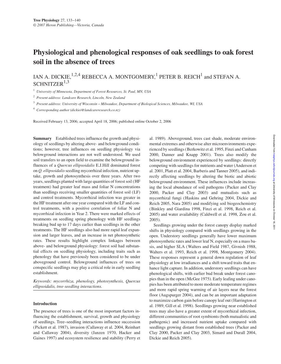 树木的存在是影响苗木建立、生存、生长和生理的重要因素之一。树-苗相互作用影响演替(Pickett et al. 1987)、入侵(Callaway et al. 2004, Reinhart and Callaway 2004)、多样性(Janzen 1970, Hacker and Gaines 1997)和生态系统的恢复力和稳定性(Perry et al . 1989年)。在地面上,树木遮荫、中度极端环境和其他改变幼苗经历的微环境(Berkowitz et al. 1995, Finzi and Canham 2000, Danner and Knapp 2001)。树木也会改变幼苗所经历的地下环境:直接与幼苗竞争营养和水(Anderson et al. 2001, Platt et al. 2004, Barberis and Tanner 2005),并通过改变地下生物和非生物环境间接影响幼苗。这些影响包括增加当地丰富的土壤病原体(Packer and Clay 2000, Packer and Clay 2003)和共生生物如菌根真菌(Haskins and Gehring 2004, Dickie and Reich 2005, Nara 2005)和修改土壤生物地球化学(Binkley and Giardina 1998, Finzi et al. 1998, Reich et al.2005)和水的可用性(Caldwell et al. 1998, Zou et al. 2005)。