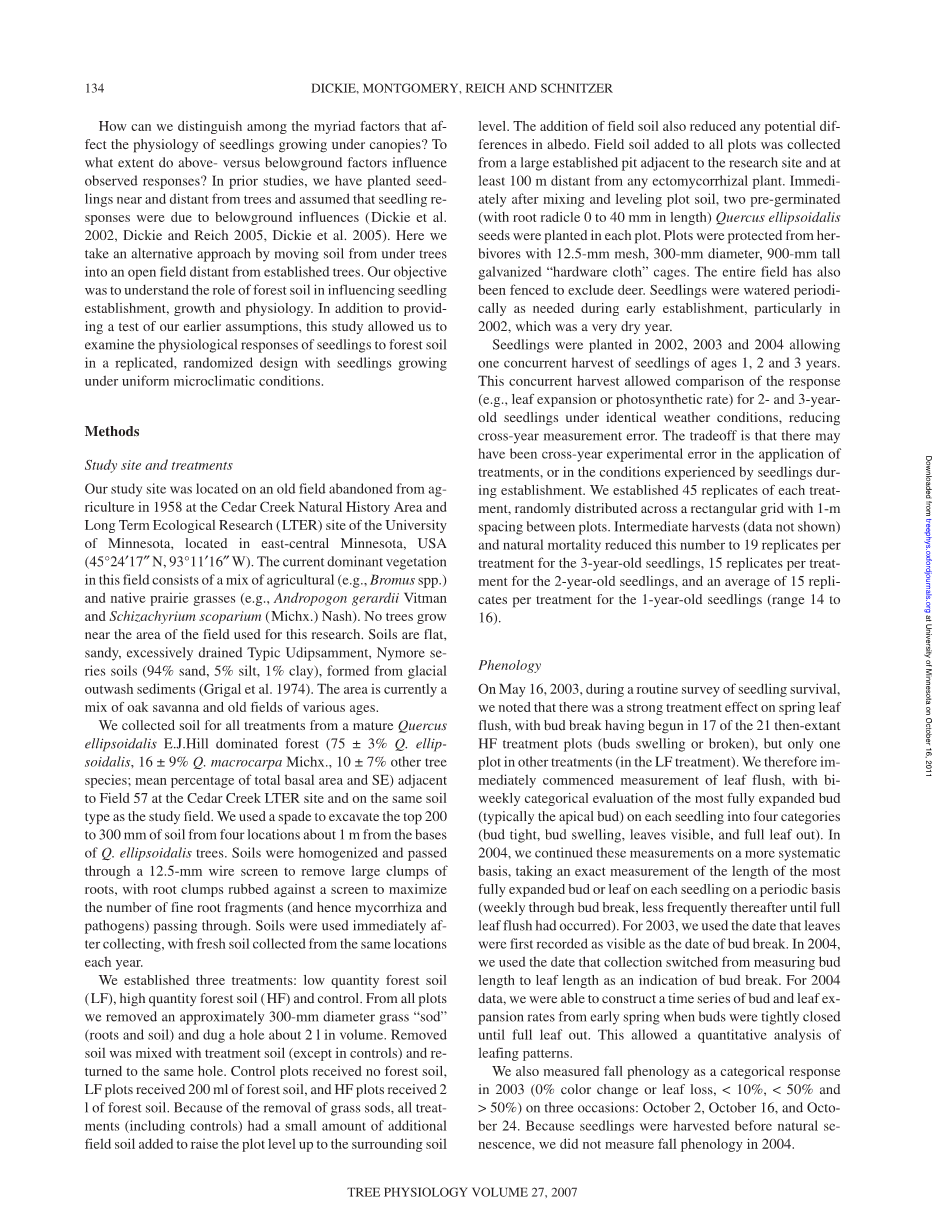 如何区分影响树冠下幼苗生理发育的众多因素?上面和下面的因素在多大程度上影响了观察到的反应?在之前的研究中,我们在离树较近或较远的地方种植了幼苗,并假设幼苗的反应是由于地下的影响(Dickie et al. 2002, Dickie and Reich 2005, Dickie et al. 2005)。在这里,我们采取了另一种方法,将土壤从树下移到远离现有树木的开阔地带。我们的目的是了解森林土壤在影响幼苗的建立、生长和生理方面的作用。除了为我们之前的假设提供了一个测试,这项研究允许我们通过重复的、随机的设计,在均匀的小气候条件下生长的幼苗来检验幼苗对森林土壤的生理反应。