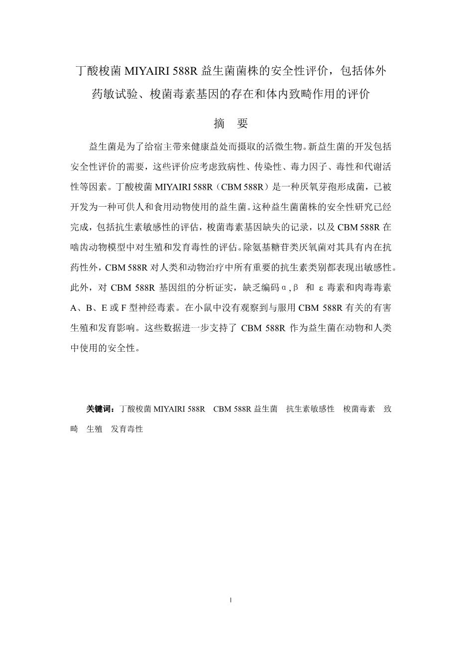 丁酸梭菌 MIYAIRI 588R 益生菌菌株的安全性评价,包括体外 药敏试验、梭菌毒素基因的存在和体内致畸作用的评价。外文翻译资料