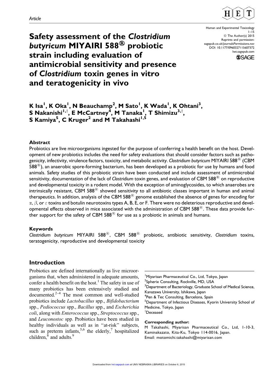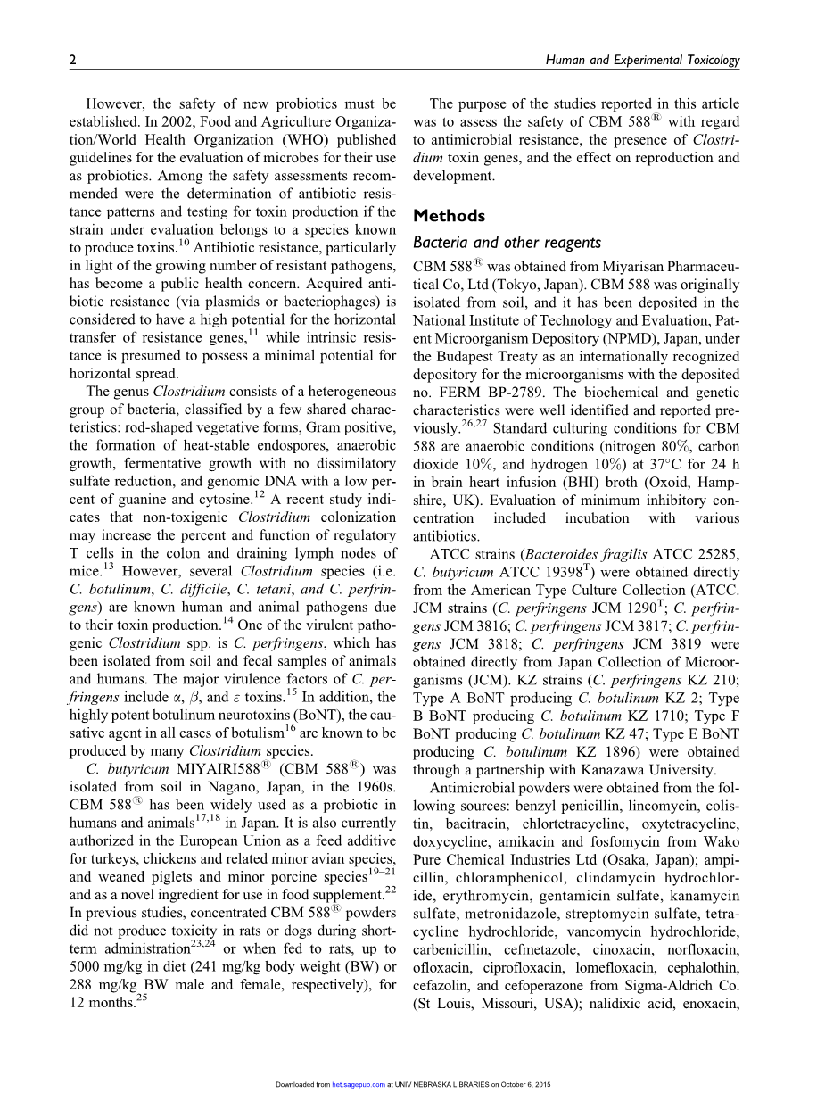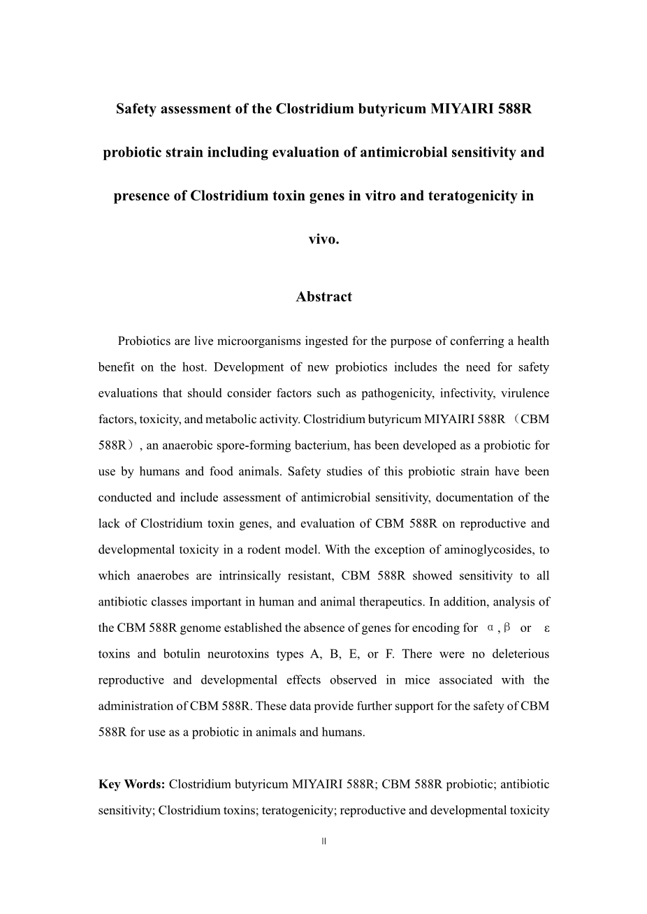 - 丁酸梭菌 MIYAIRI 588R 益生菌菌株的安全性评价,包括体外 药敏试验、梭菌毒素基因的存在和体内致畸作用的评价。外文翻译资料