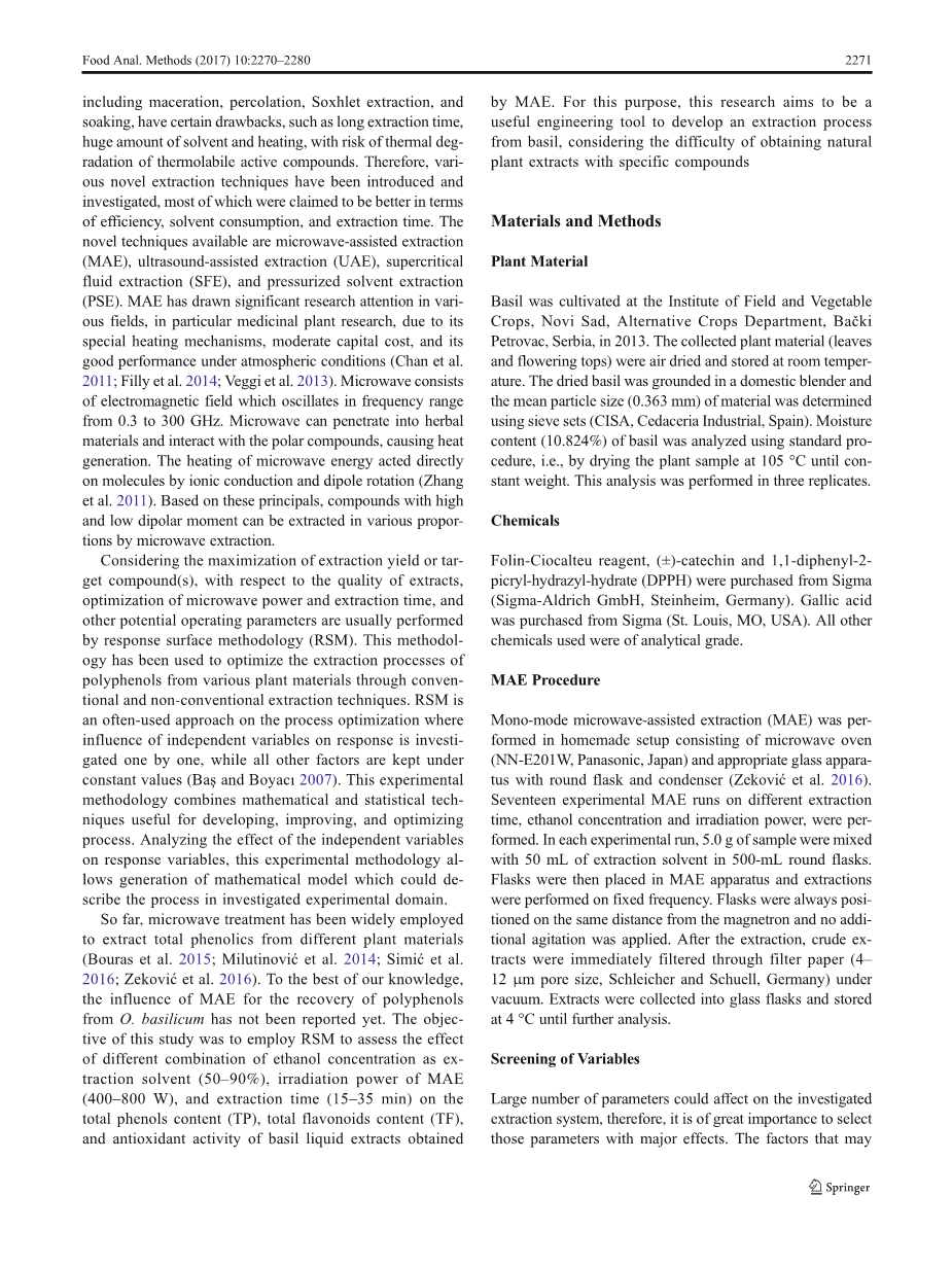 迄今为止,微波处理已被广泛用于从不同植物材料中提取总酚类化合物(Bouras等人2015; Milutinović等人2014; Simić等人2016; Zeković等人2016)。据我们所知,MAE对从罗勒中提取多酚的影响尚未见报道。这项研究的目的是采用RSM评估乙醇浓度(50-90%)、MAE的照射功率(400-800 W)和提取时间(15-35分钟)的不同组合对乙醇的影响,从而得到由MAE获得的罗勒液体提取物的总酚含量(TP),总类黄酮含量(TF)和抗氧化活性。为此,考虑到难以获得具有特定化合物的天然植物提取物的困难,本研究旨在成为开发罗勒提取工艺的有用工程工具。