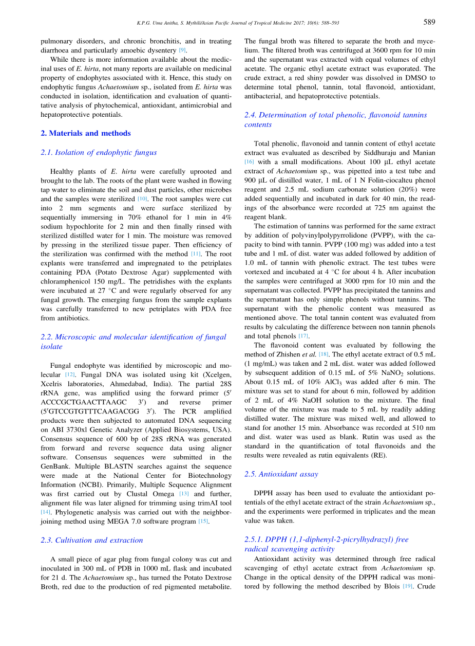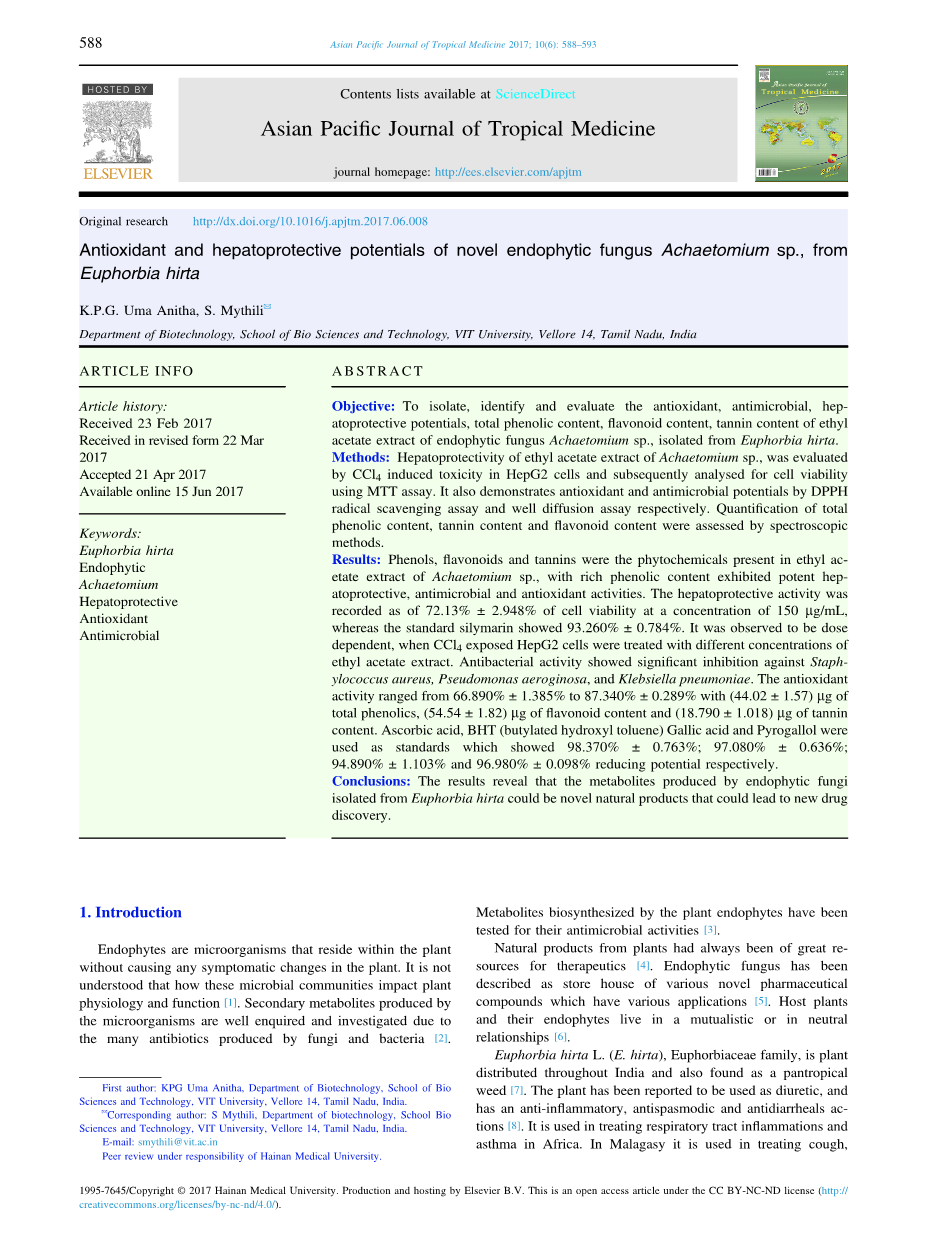 虽然有更多关于飞扬草的药用用途的信息,但关于与其相关的内生菌的药用性质的报道并不多。因此,从飞扬草分离的内生真菌Achaetomium sp.的研究是在分离、鉴定和评估植物化学、抗氧化、抗微生物和保肝潜力的定量分析的情况下进行的。