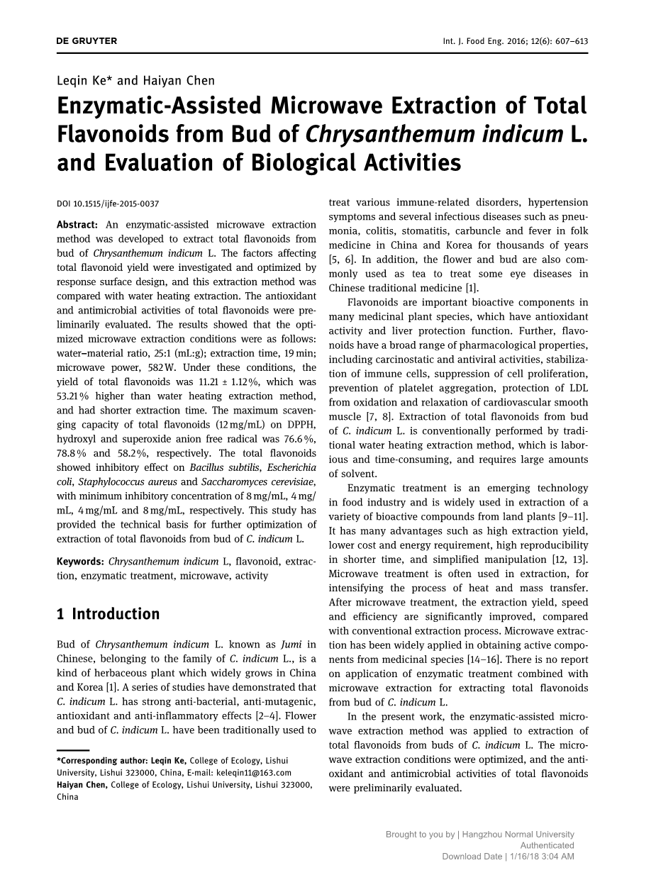 酶辅助微波从芽野菊花提取总黄酮和生物活性评价外文翻译资料