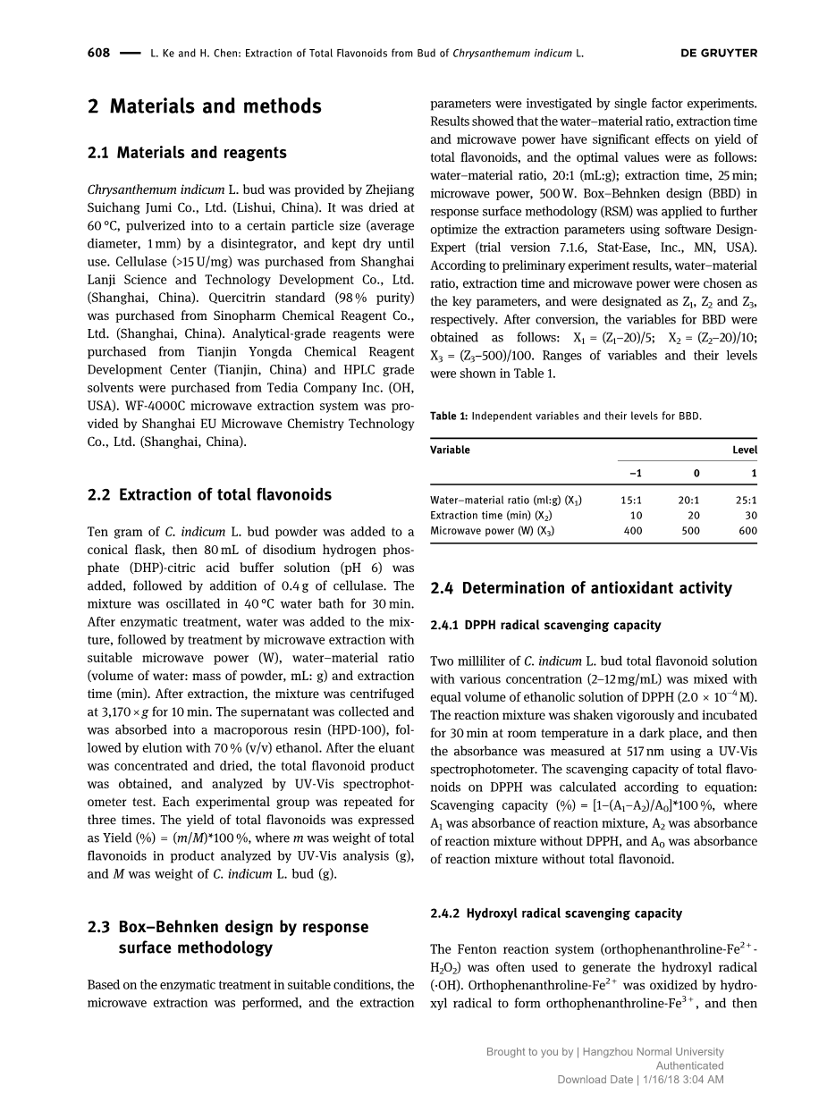 在目前的工作中,酶辅助微波萃取法被应用于芽C. indicum L.总黄酮的提取。微波萃取条件进行了优化,初步评价了总黄酮的抗氧化和抑菌活性。