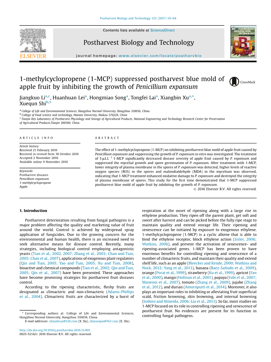 本文研究了1-甲基环丙烯(1-MCP)对扩展青霉(P.expansum)导致的苹果青霉病害以及P.expansum在体外生长的抑制作用。5mu;L L-11-MCP处理可显著降低P.expansum导致的苹果果实的病害程度,抑制P.expansum的菌丝生长和孢子萌发。1-MCP处理后,P.expansum的孢子质膜完整性降低,孢子中的活性氧合物和菌丝中的丙二醛剧增,表明1-MCP处理可增强P.expansum氧化损伤以及破坏孢子质膜的完整性。这项研究首次表明,1-MCP通过抑制P.expansum生长来抑制采后苹果青霉病害。