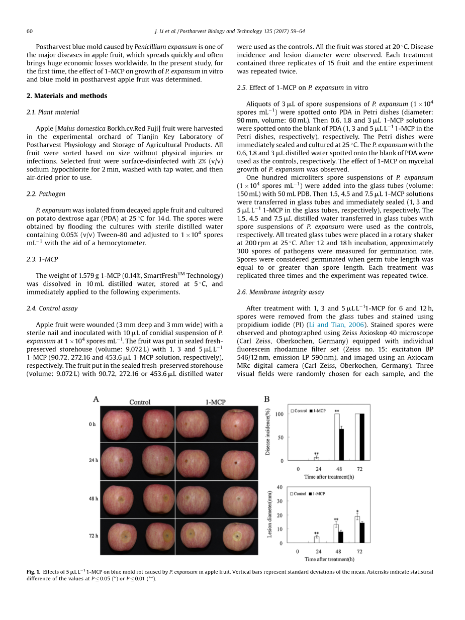 P.expansum引起的采后青霉病是苹果果实中的主要病害之一,其传播速度快,往往带来了巨大的全球经济损失。在本研究中,首次确定了1-MCP对P.expansum体外对苹果采后青霉生长的影响。