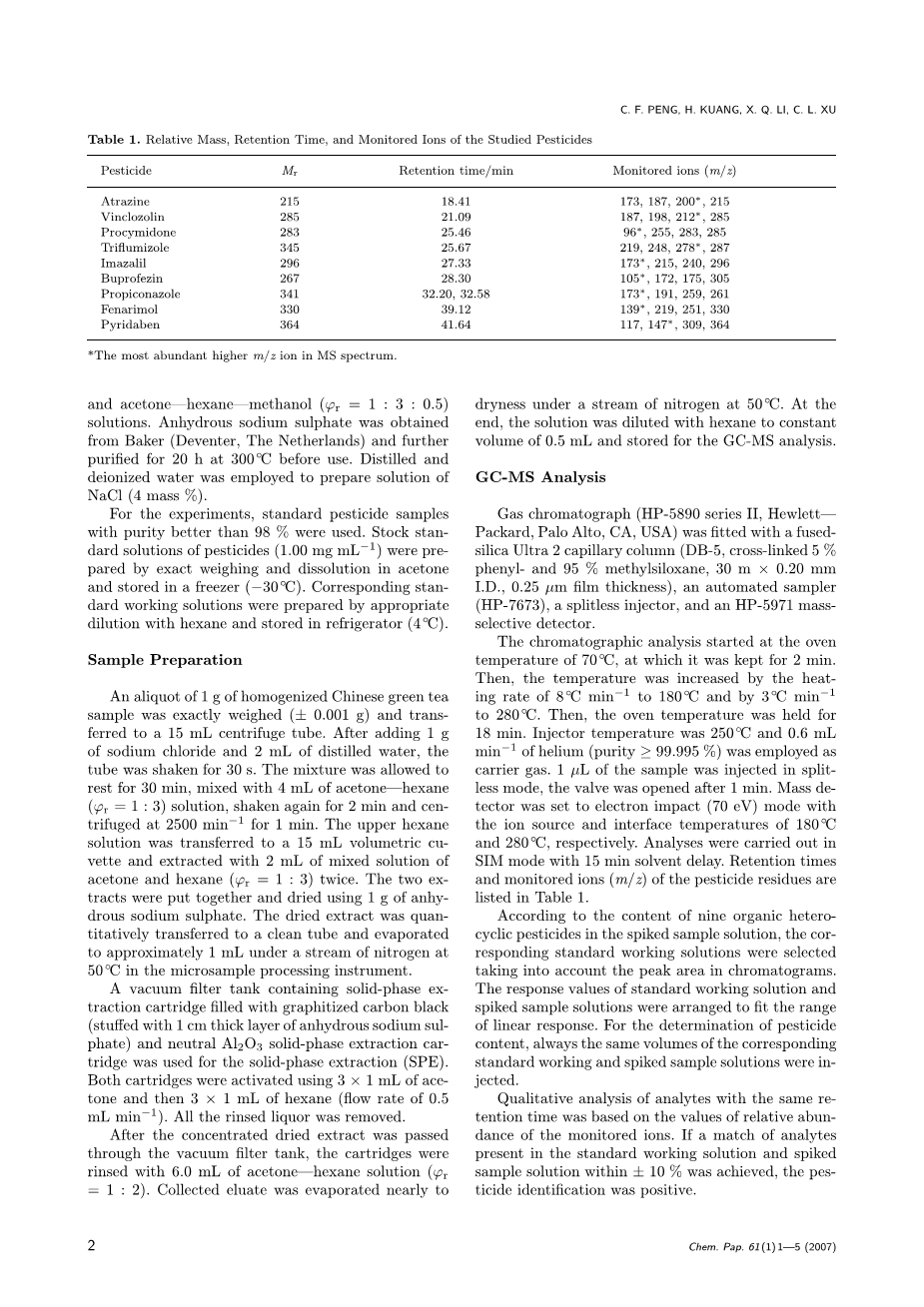 对于实验,使用纯度优于98%的标准农药样品 农药标准溶液(1.00 mg·mL-1)通过精确称量并溶解在丙酮中进行预先配制,并储存在冰箱(-3℃)中。相应的标准工作溶液通过用己烷适当稀释制备并储存在冰箱(4℃)中。