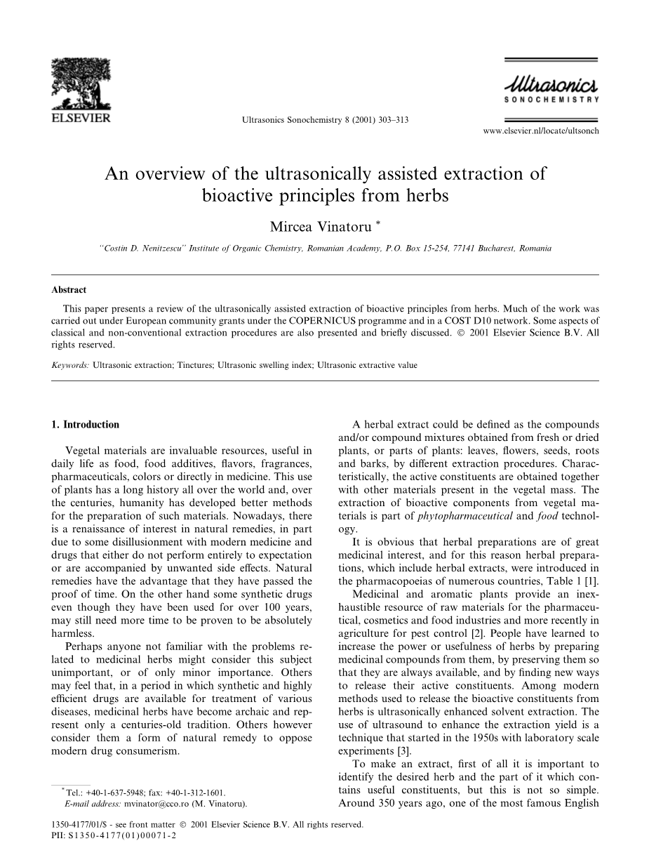 摘要:本文对超声辅助提取草药中生物活性成分进行了综述。大部分工作是在欧洲共同体的资助下,在哥白尼方案和成本D10网络下进行的。并对活性成分提取的传统方法和新方法的提取步骤进行了介绍和讨论。