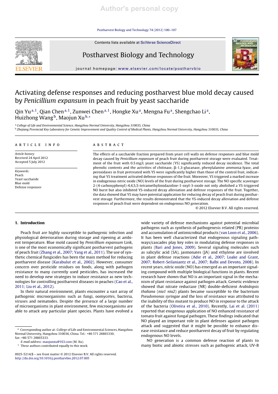 通过酵母多糖,激活防御反应并减少桃果实中扩展青霉所引起的蓝色霉菌腐烂
